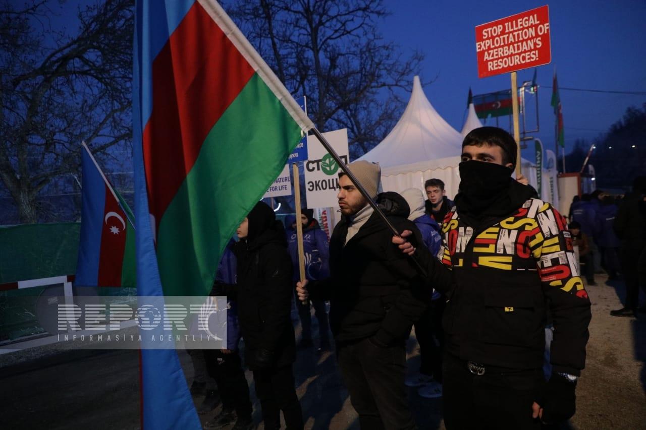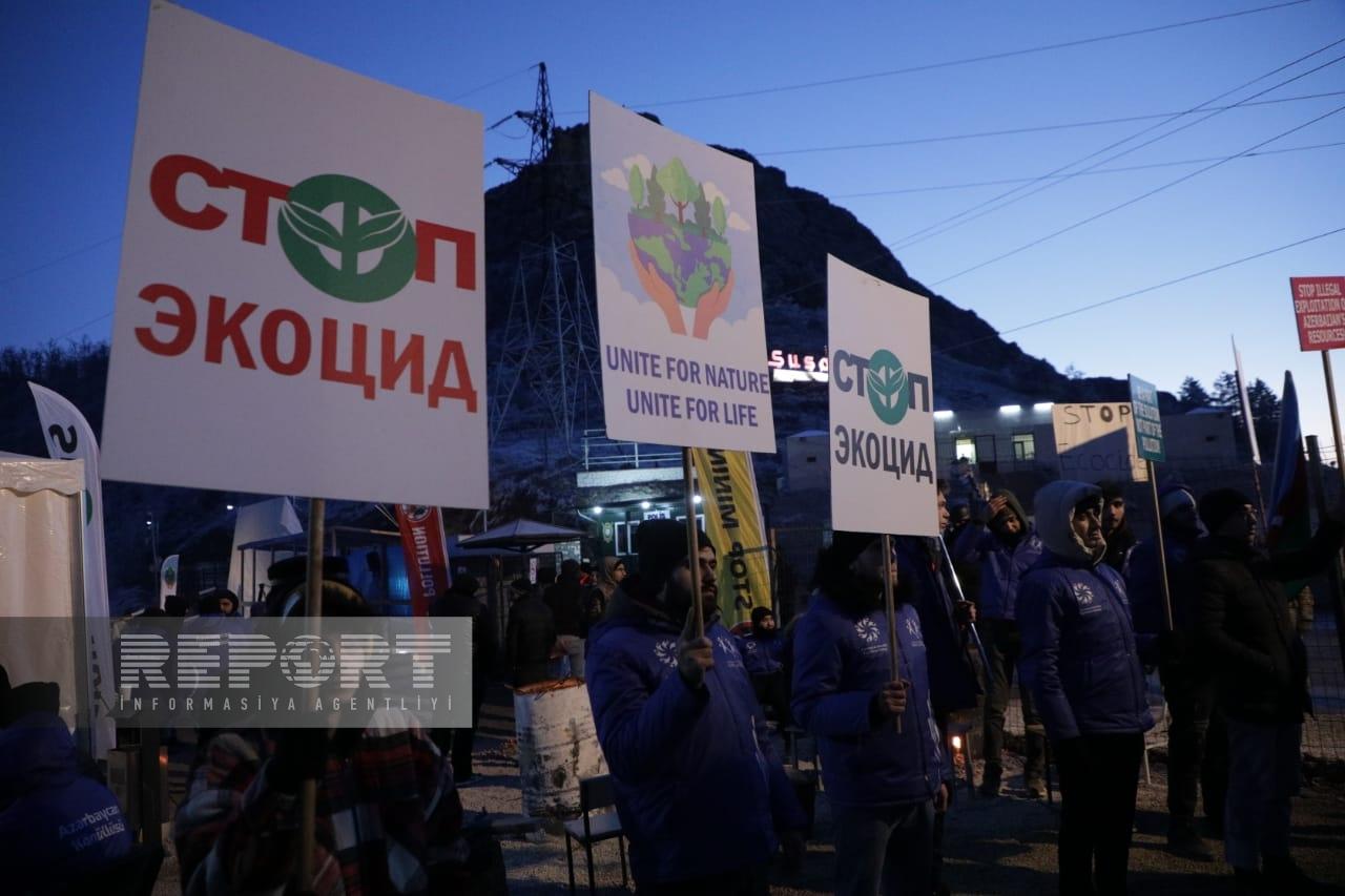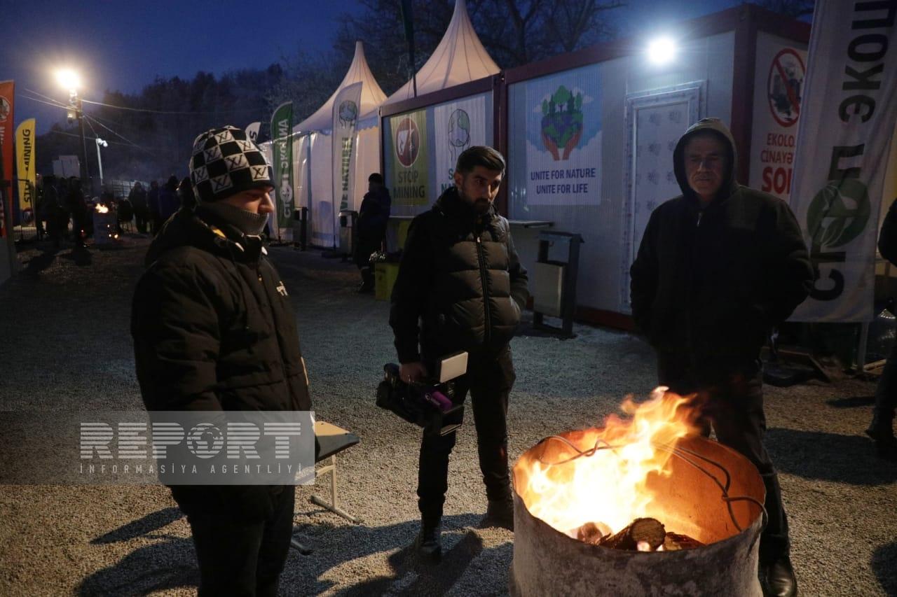 Hazırda havanın soyuq və şaxtalı olmasına baxmayaraq, dinc aksiya iştirakçıları Azərbaycanın Dövlət Himni oxuyur, “Azərbaycan oyaqdır, sərvətinə dayaqdır!”, “Azərbaycan vahiddir, sərvətinə sahibdir!”, “Ekoloji cinayətə son!”, “Stop ekoterror!” şüarlarını səsləndirirlər.