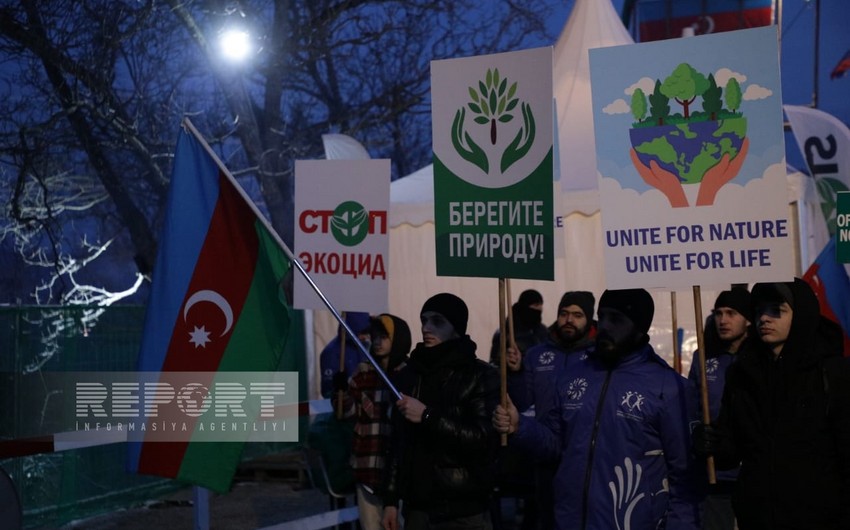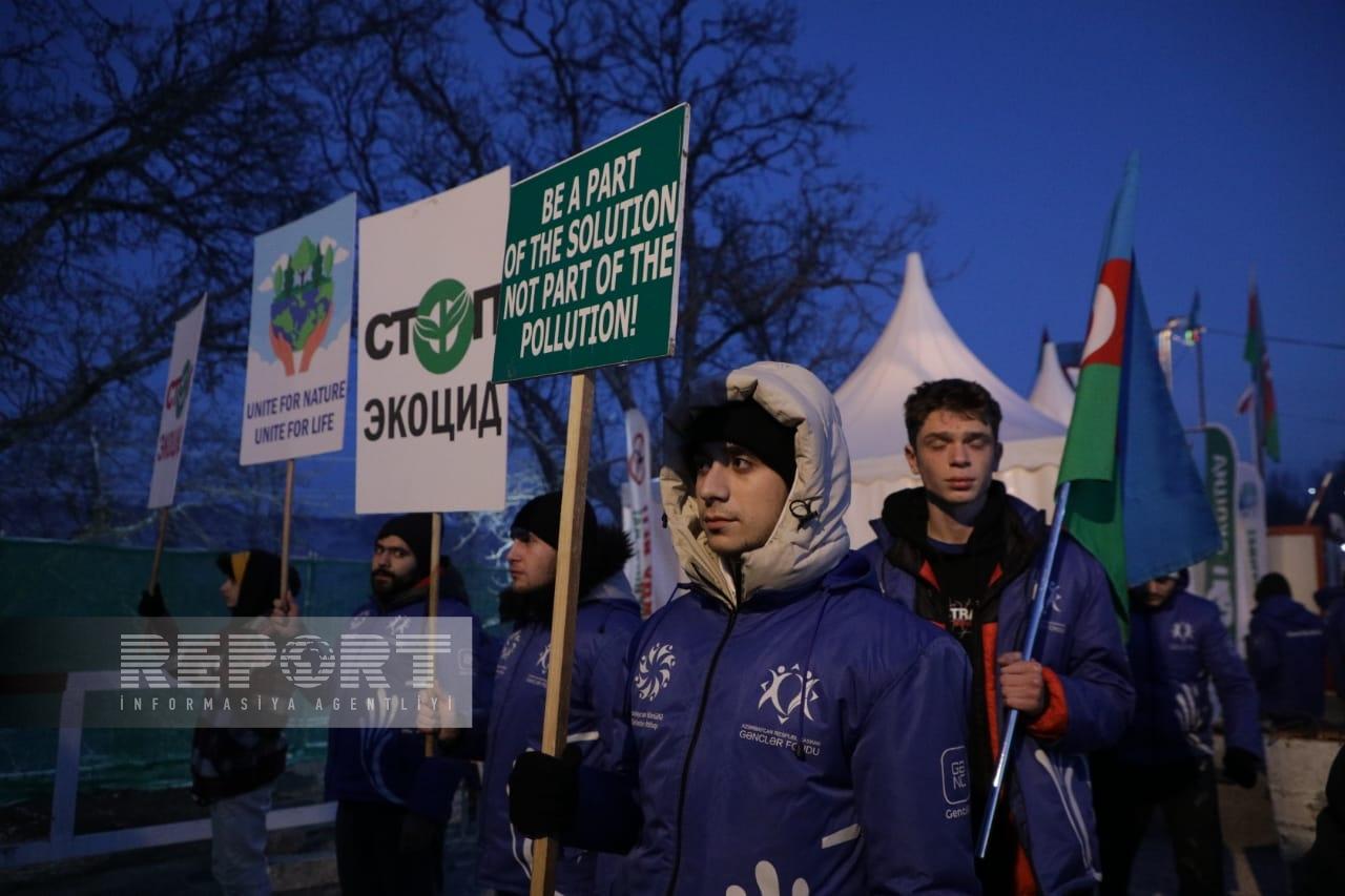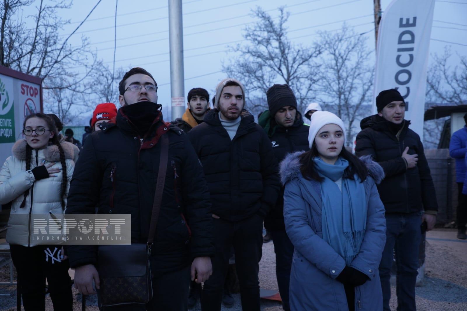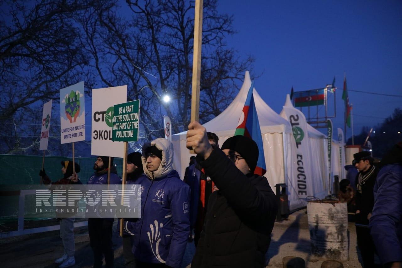 Hazırda havanın soyuq və şaxtalı olmasına baxmayaraq, dinc aksiya iştirakçıları Azərbaycanın Dövlət Himni oxuyur, “Azərbaycan oyaqdır, sərvətinə dayaqdır!”, “Azərbaycan vahiddir, sərvətinə sahibdir!”, “Ekoloji cinayətə son!”, “Stop ekoterror!” şüarlarını səsləndirirlər.