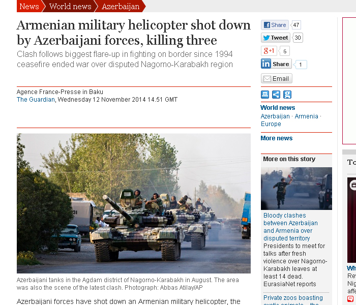 Helikopterin vurulması ilə bağlı Azərbaycan və Ermənistan tərəfdən verilən rəsmi açıqlıamalarıın da yer aldığı məqalədə vurğulanır ki, Dağlıq Qarabağ münaqişəsi nəticəsində 30 min insan ölüb.