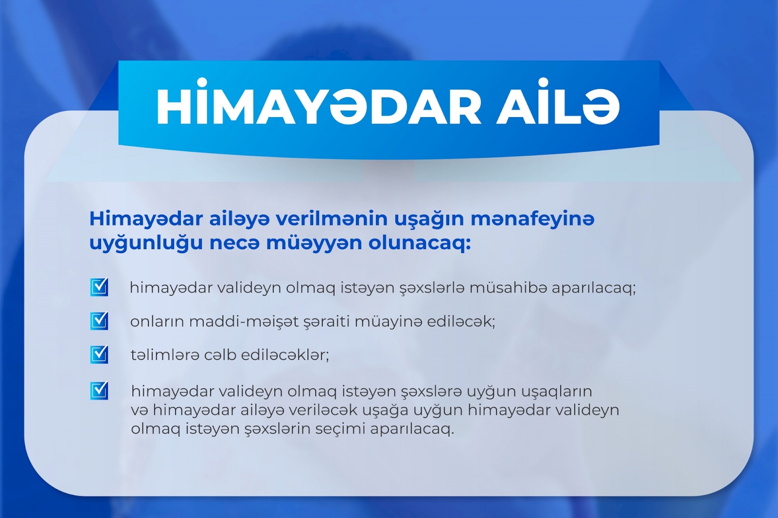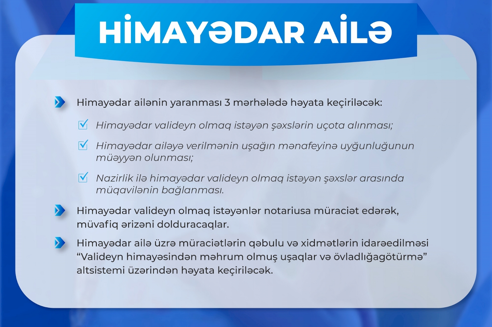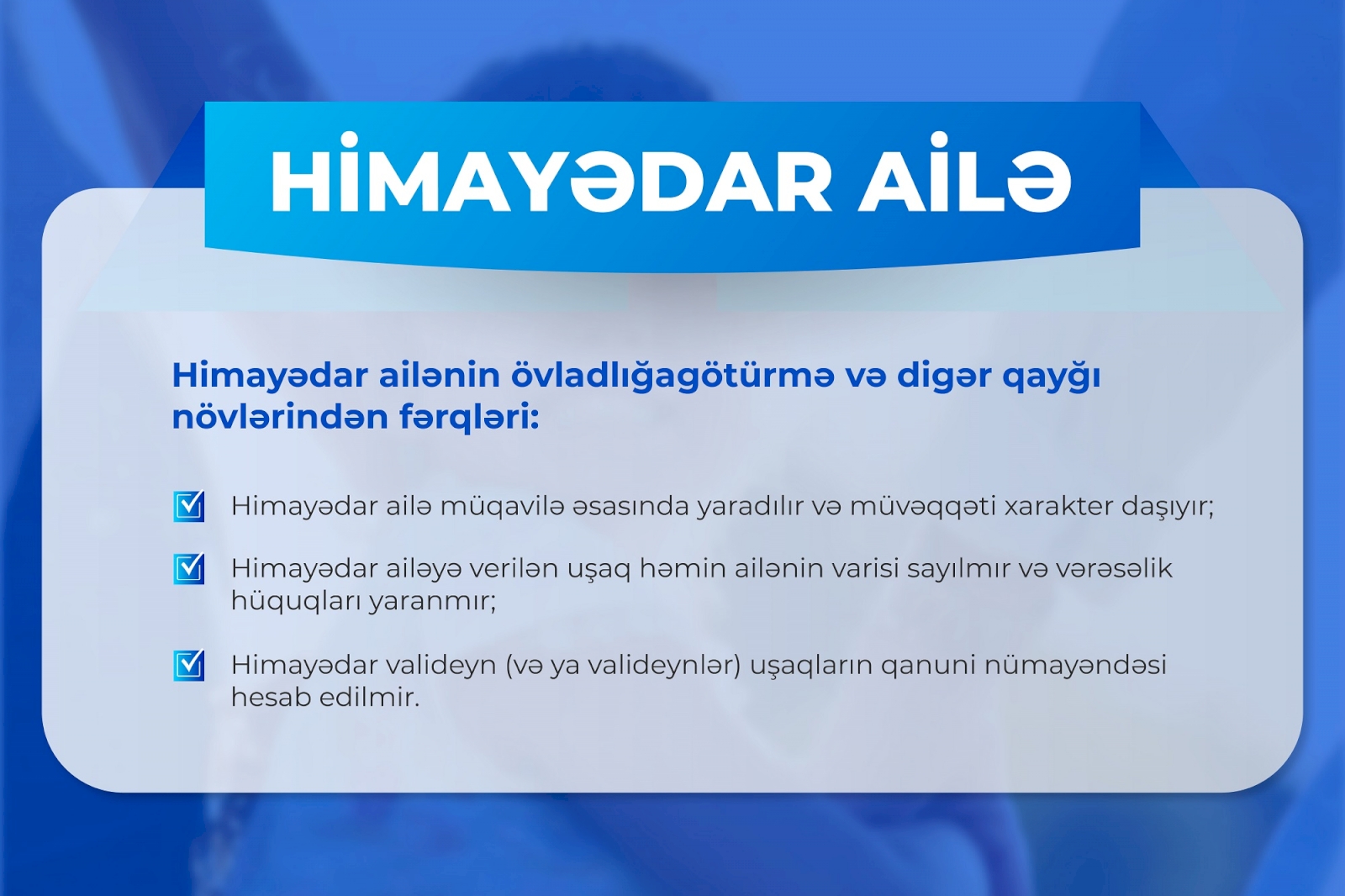 Prezident İlham Əliyevin imzaladığı qanunvericilik aktları ilə ölkəmizdə tətbiqinə başlanan “Himayədar ailə” qayğı modeli valideynlərini itirmiş, valideyn himayəsindən məhrum olmuş və valideynləri tərəfindən müəssisəyə qoyulmuş uşaqların qısa və ya uzun müddət dövlət nəzarəti altında ödənişli əsaslarla ailə mühitində böyüməsi və inkişafına xidmət edir.