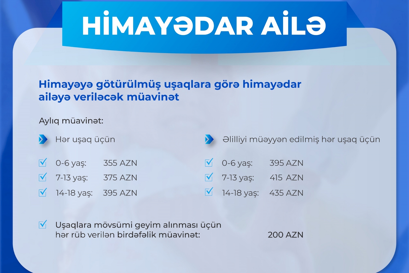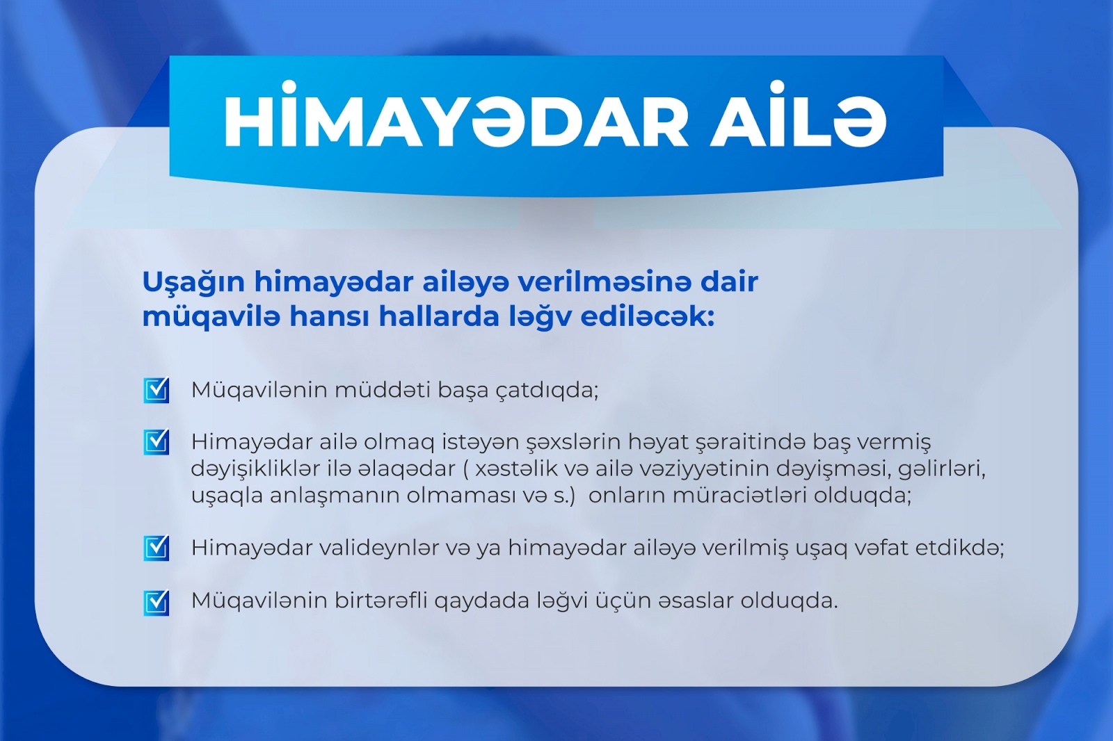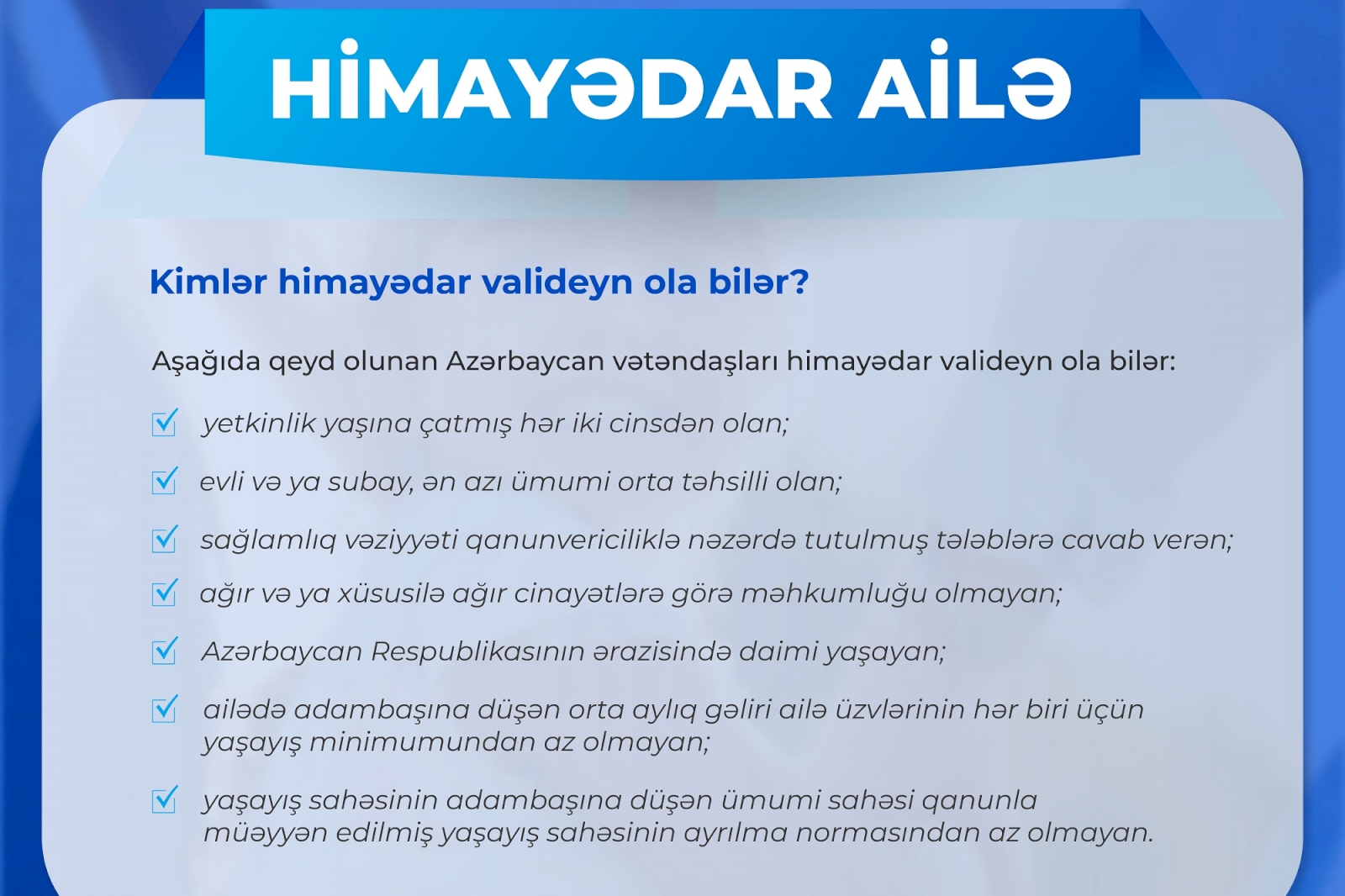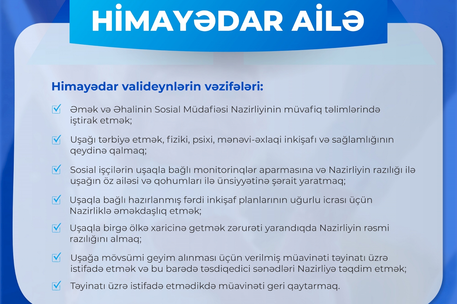 Prezident İlham Əliyevin imzaladığı qanunvericilik aktları ilə ölkəmizdə tətbiqinə başlanan “Himayədar ailə” qayğı modeli valideynlərini itirmiş, valideyn himayəsindən məhrum olmuş və valideynləri tərəfindən müəssisəyə qoyulmuş uşaqların qısa və ya uzun müddət dövlət nəzarəti altında ödənişli əsaslarla ailə mühitində böyüməsi və inkişafına xidmət edir.