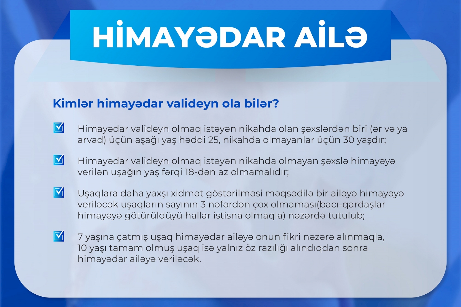 Kimlər və necə himayədar valideyn ola bilər? Bunun üçün aşağı yaş həddi neçədir? Himayədar valideynlərin hansı hüquq və vəzifələri var? Himayədar ailəyə verilmənin uşağın mənafeyinə uyğunluğu necə müəyyən edilir? Neçə uşaq himayəyə götürmək olar? “Himayədar ailə” qayğı modelinin uşağı övladlığa götürmədən fərqi nədir? Bu və mövzu ilə bağlı digər məsələlərə dair məlumatlandırıcı posterləri təqdim edirik.