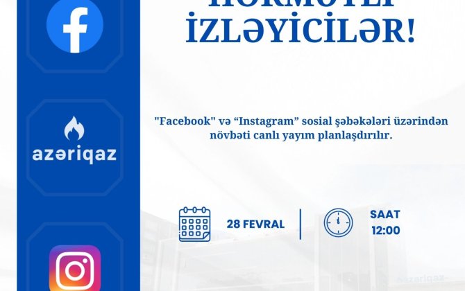 Fevral ayının 28-də saat 12:00-da "Facebook" və "Instagram" sosial şəbəkələri üzərindən “Azəriqaz” İB rəhbərliyinin növbəti canlı yayımı planlaşdırılır. Siz qaz təsərrüfatına dair istənilən sualla canlı yayımda müraciətlərinizi edə bilərsiniz.