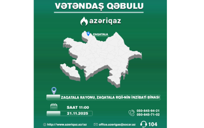 SOCAR-ın “Azəriqaz” İB-nin baş direktorunun Zaqatala rayonunda vətəndaş qəbulu 21 noyabr saat 11:00-da Zaqatala Regional Qaz İstismarı İdarəsinin inzibati binasında (Ünvan: Faiq Əmirov küçəsi, dalan 1/11) baş tutacaq.