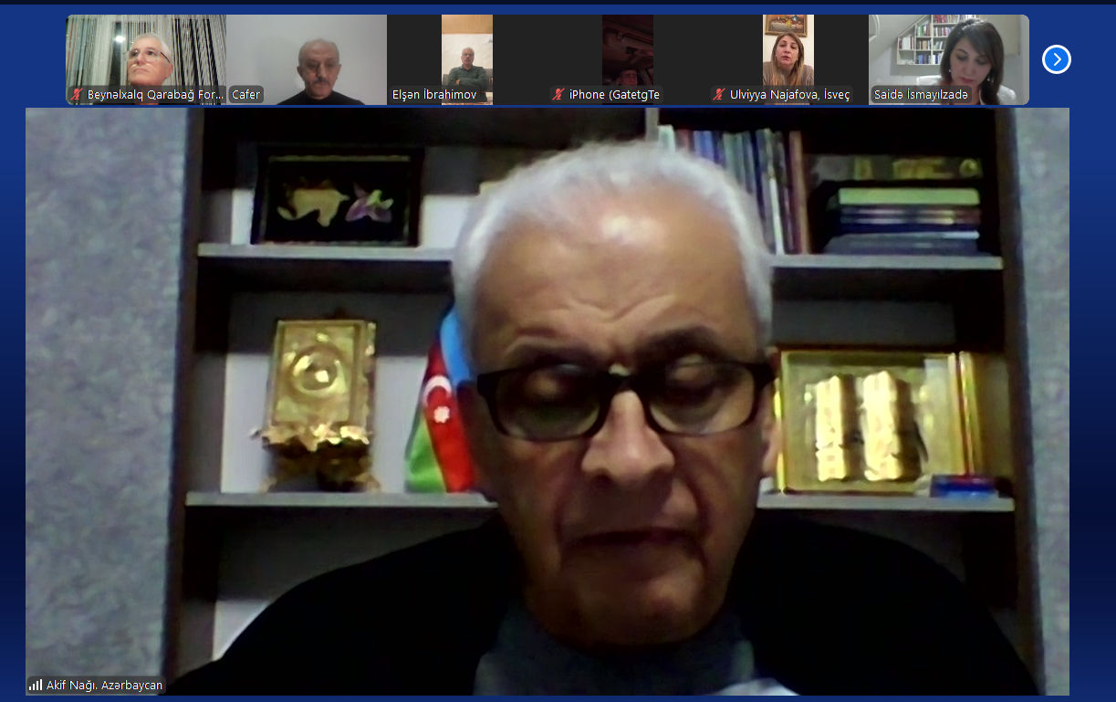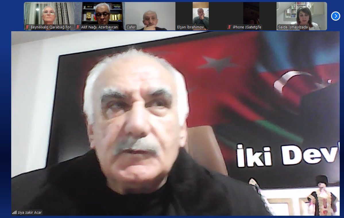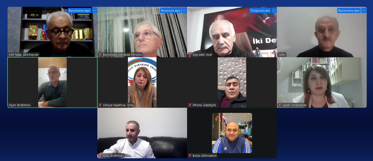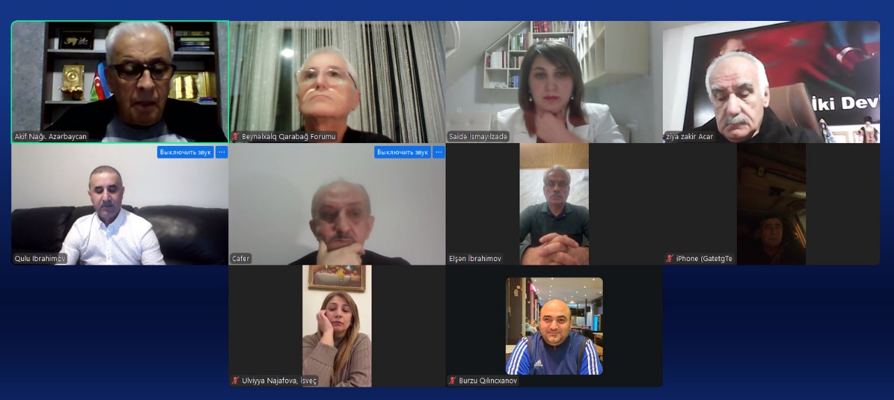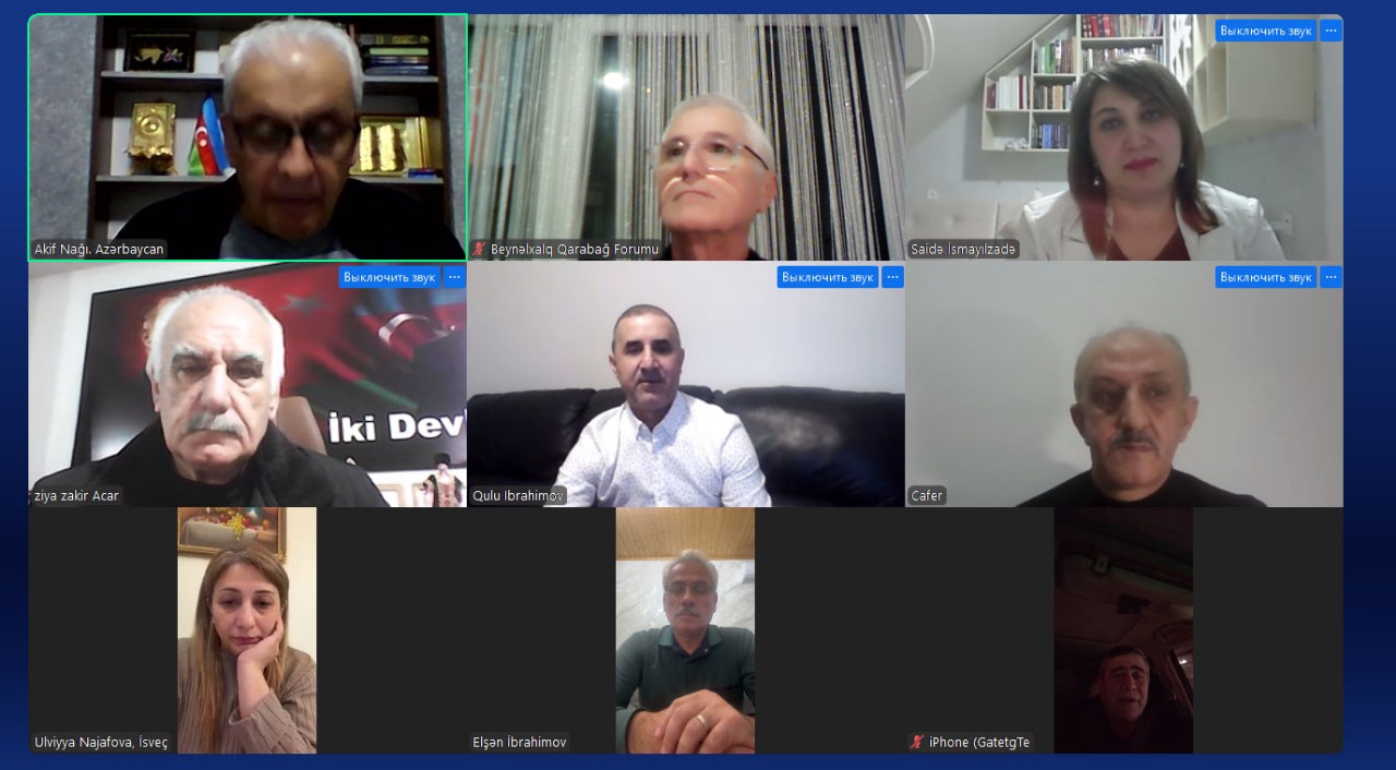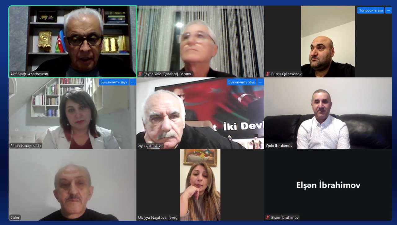 Beynəlxalq Qarabağ Forumu İdarə heyətinin onlayn formatda növbəti iclası keçirilib. İclasa təşkilat rəhbərləri, elm adamları, o cümlədən Azərbaycandan Akif Nağı, Şamil Mehdi, Novrhz Novruzov, Səidə İsmayılzadə, Türkiyədən Ziya Zakir Acar, Cafer Dal, Rusiya təmsilçiləri Elşən İbrahimov, Təhmasib Zeynalov, Ukraynadan Qulu İbrahimov, İsveçdən Ülviyyə Nəcəfova, Almaniyadan Burzu Qılıncxanov qatılıb.