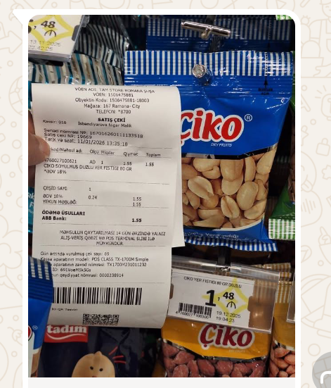 Bildirilib ki, kassa ilə vitrin qiyməti arasında 7 qəpik fərq var. Vitrində 1 manat 48 qəpik olan məhsulun qiyməti çekdə 1 manat 55 qəpik olaraq qeyd edilib.