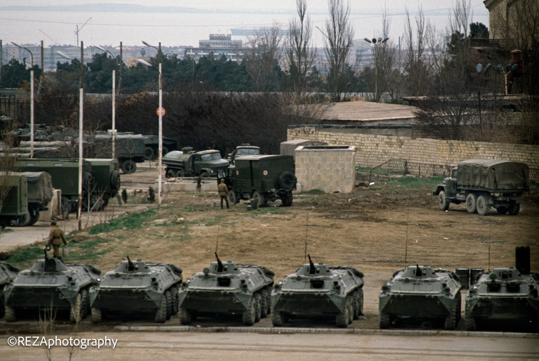 “Bakı tanklar və əsgər patrulları ilə mühasirəyə alınmışdı. Açıq şəkildə, gördüklərimizin şəkillərini çəkmək çox riskli idi. Ehtiyyatlı davranmalı, maşınların və binaların pəncərələrindən fotolar çəkəndə kameranı gizlətməyin yollarını tapmalı idik.”