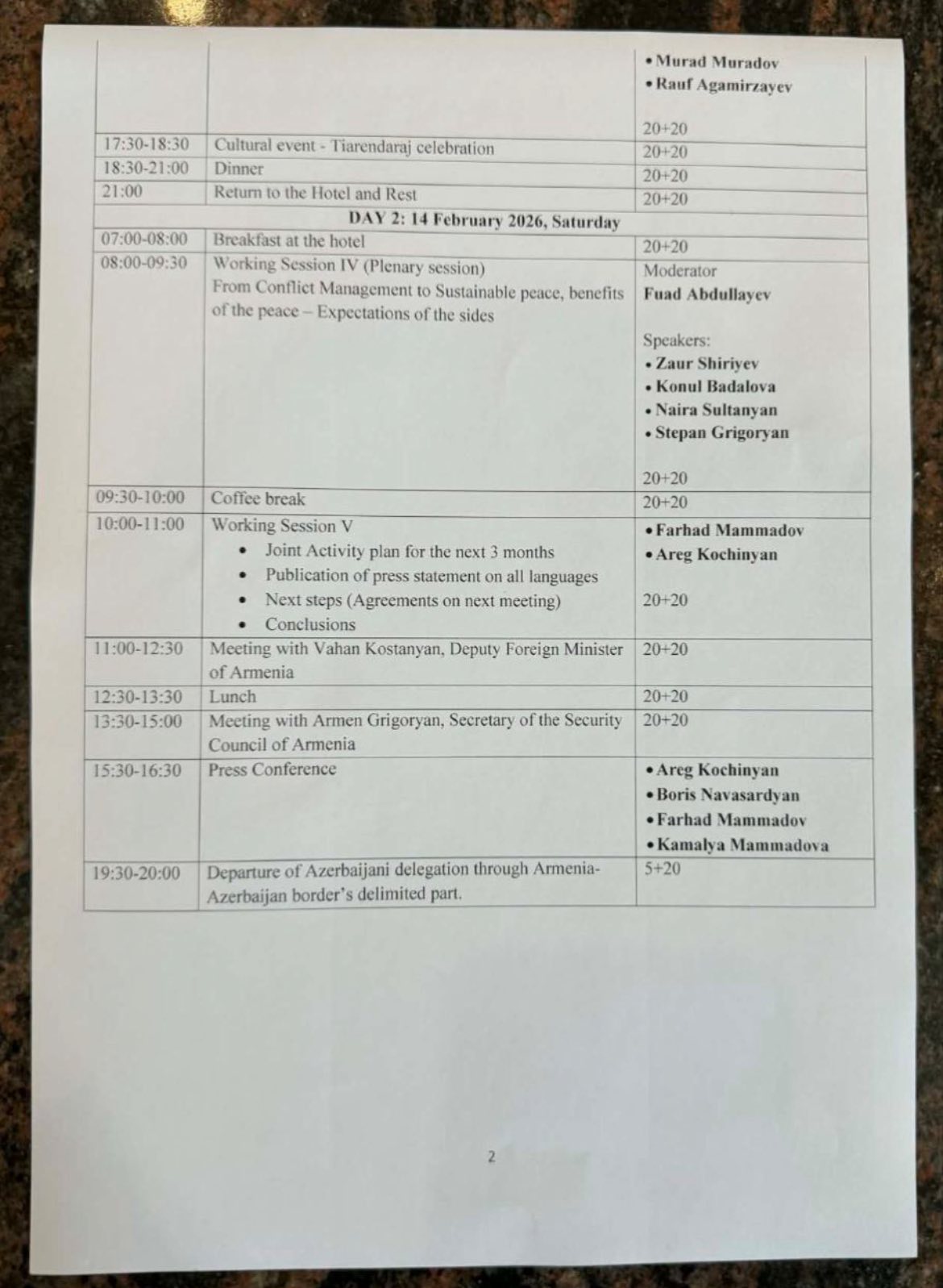Görüşün iştirakçısı - Cənubi Qafqaz Tədqiqatlar Mərkəzinin (CQTM) direktoru Fərhad Məmmədov sosial media heabında bildirib ki, Azərbaycan nümayəndə heyəti Ermənistanda təxminən 35 saat keçirib. Bu müddətdə hoteldə dörd saatlıq transfer, dörd müzakirə sessiyası, rəsmi şəxslərlə iki görüş, mətbuat konfransı və davam edən qeyri-rəsmi dialoq olub: