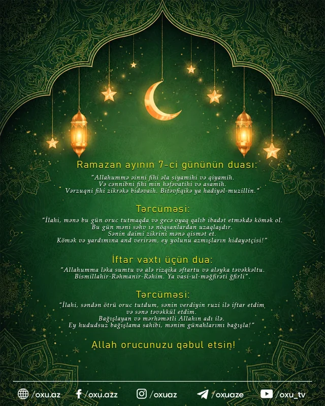 "İlahi, mənə bu gün oruc tutmaqda və gecə oyaq qalıb ibadət etməkdə kömək ol. Bu gün məni səhv və nöqsanlardan uzaqlaşdır. Sənin daimi zikrini mənə qismət et. Kömək və yardımına and verirəm, ey yolunu azmışların hidayətçisi!"