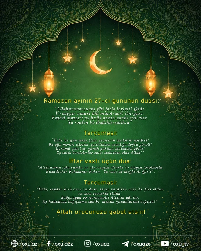 "İlahi, bu gün mənə Qədr gecəsinin fəzilətini nəsib et! Bu gün mənim işlərimi çətinlikdən asanlığa doğru yönəlt! Üzrümü qəbul et, günah yükünü üstümdən götür! Ey saleh bəndələrinə qarşı mehriban olan Allah!"