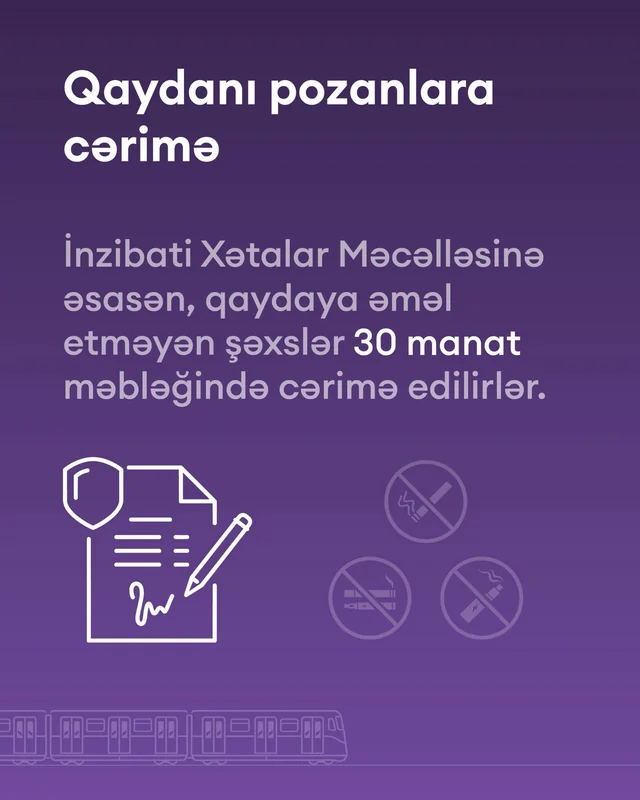 İnzibati Xətalar Məcəlləsinə edilən son dəyişikliklərə əsasən, 1 aprel tarixindən Bakı metropoliteninin stansiyalarında və qatarlarda elektron siqaretlərdən istifadə qadağası qüvvəyə minir.