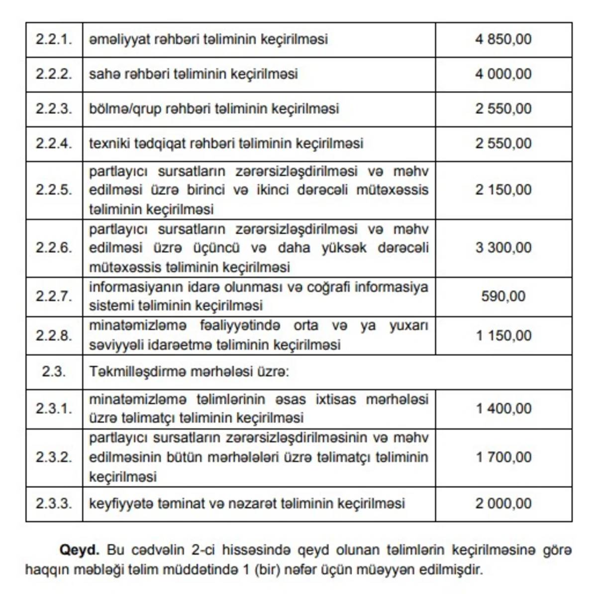 Nazirlər Kabineti "Minatəmizləmə fəaliyyətinin həyata keçirilməsi üçün qiymətləndirmənin aparılmasına və təlimlərin keçirilməsinə görə haqqın məbləği"ni təsdiq edib.