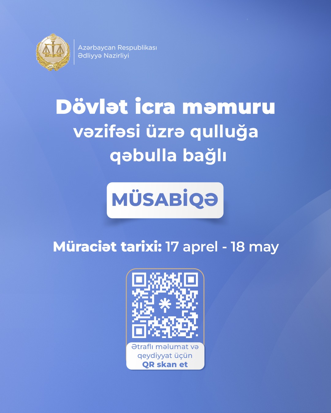 Ədliyyə Nazirliyinin Müsabiqə Komissiyası dövlət icra məmuru vəzifəsi üzrə qulluğa qəbulla bağlı müsabiqə elan edir.