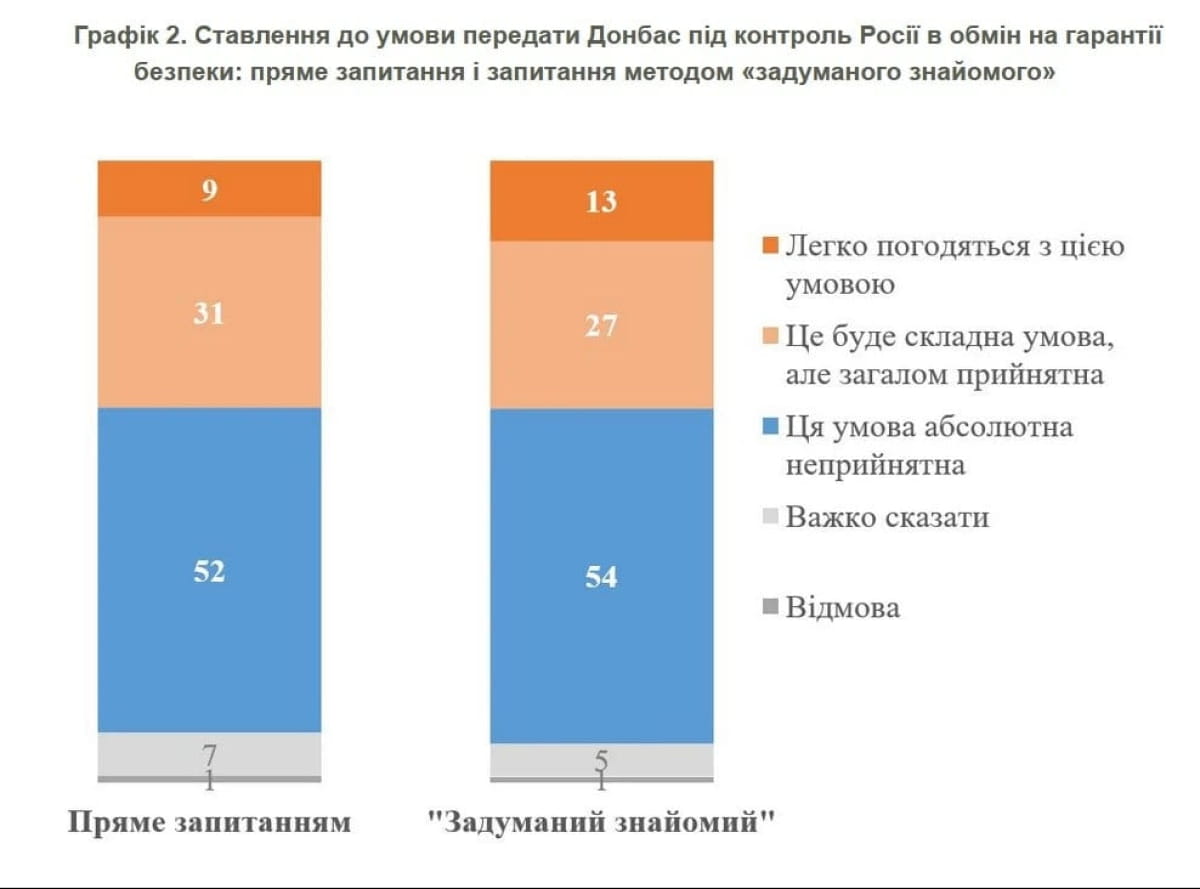 Sorğuya görə, 52 faiz ukraynalı Donbasın tam nəzarətinin Rusiyaya verilməsini qətiyyən qəbul etməz. 40 faiz respondent isə Ukraynanın hazırda nəzarət etdiyi ərazilərdən - Kramatorsk, Slavyansk və digər hissəsindən qoşunlarını çıxarıb Rusiyanın nəzarətinə verməyə hazırdır, əvəzində ABŞ və Avropadan təhlükəsizlik zəmanətləri alacaq. Bununla belə, 31 faiz bu şərtin mürəkkəb olduğunu bildirir, 7 faiz isə fikrini bildirməkdə çətinlik çəkib.
