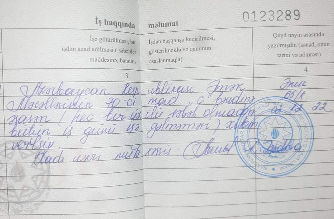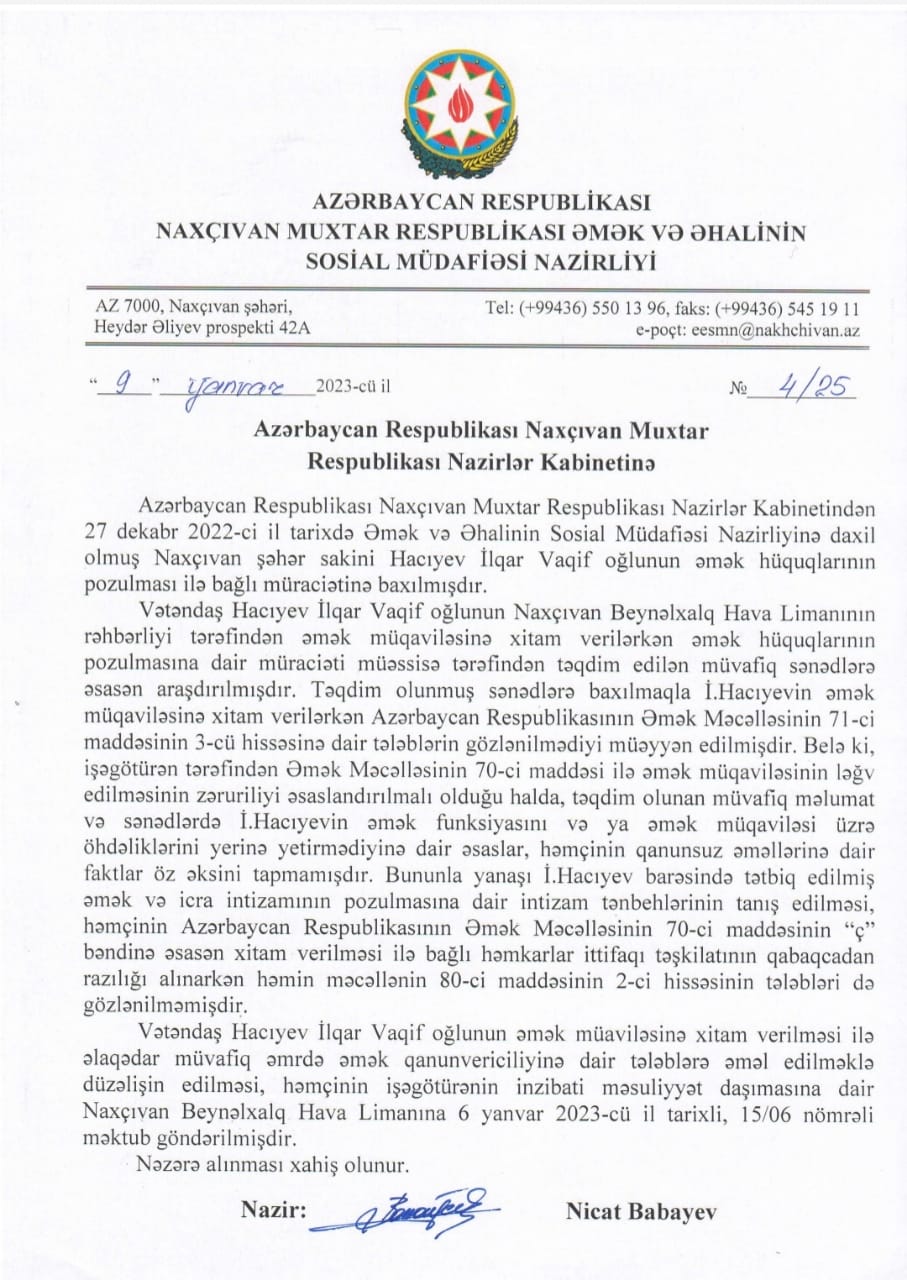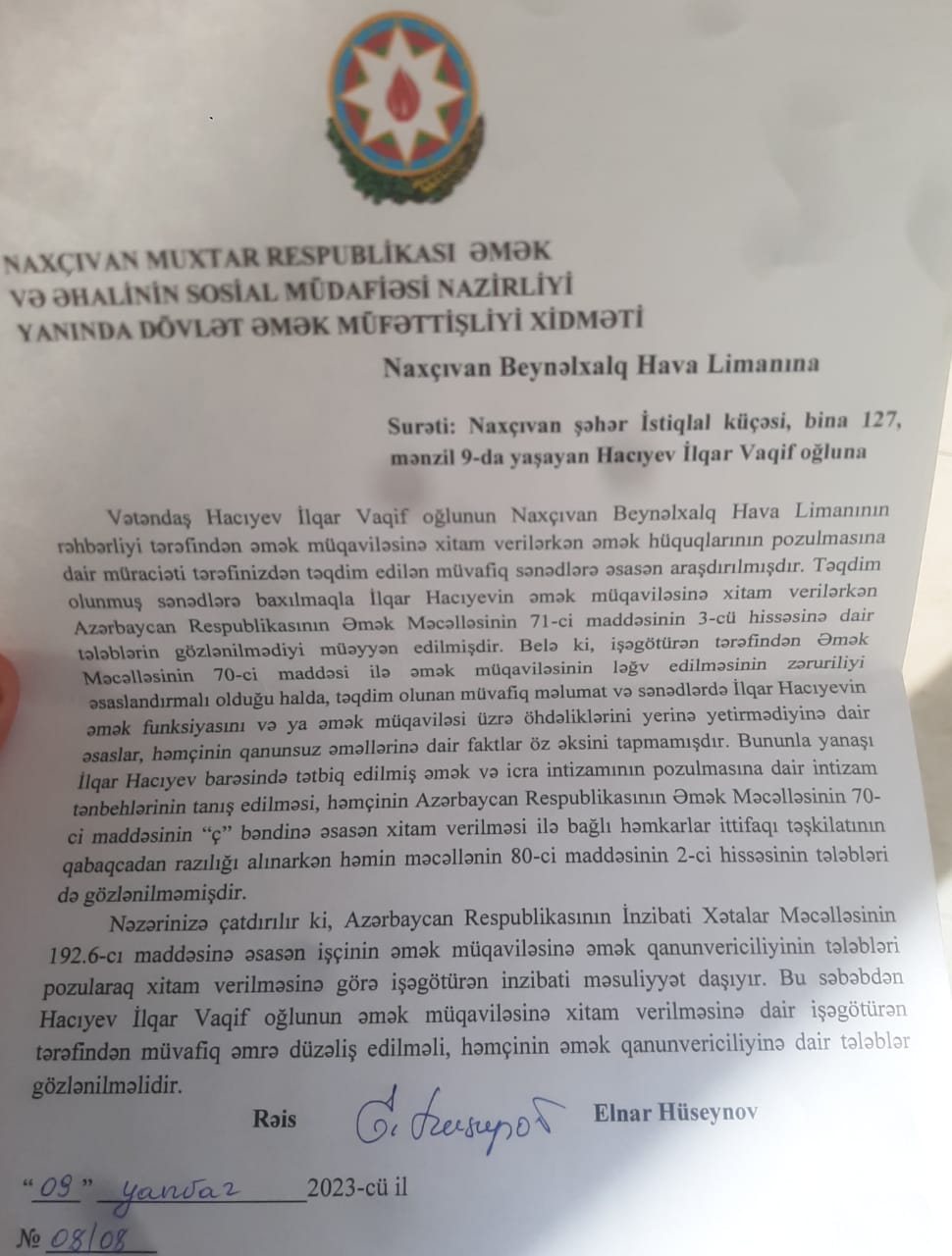 02.12.2022 il tarixdə Naxçıvan Beynəlxalq Hava Limanın direktoru Mənşur Gülməmmədlinin tapşırığı ilə kadr üzrə dirnaqarasi "mütəxəssis" Ayşən Əsədova məni Azərbaycan Respublikasının Əmək Məcəlləsinin 70-ci maddəsinin “ç” bəndinə əsasən (heç bir üzrlü səbəb olmadan bütün günü işə gəlməmə) işimə xitam verərək məni işdən azad edib. Bir daha bildirmək istəyirəm ki , işə 12 saatlıq növbəmə getməmə və işə zəng vurub məlumat verə bilməmə səbəbim polis idarəsində üzrlü səbəbdən olmağımdır. Xahiş edirəm ki, atasız gənc və ailə başçısı olmağımı nəzərə alasınız. Məni işimə bərpa etmələrinə, əmək kitabçamda yazılan maddəni silmələri ilə bağlı göstəriş verəsiniz. Heç bir işə girə bilmirəm.