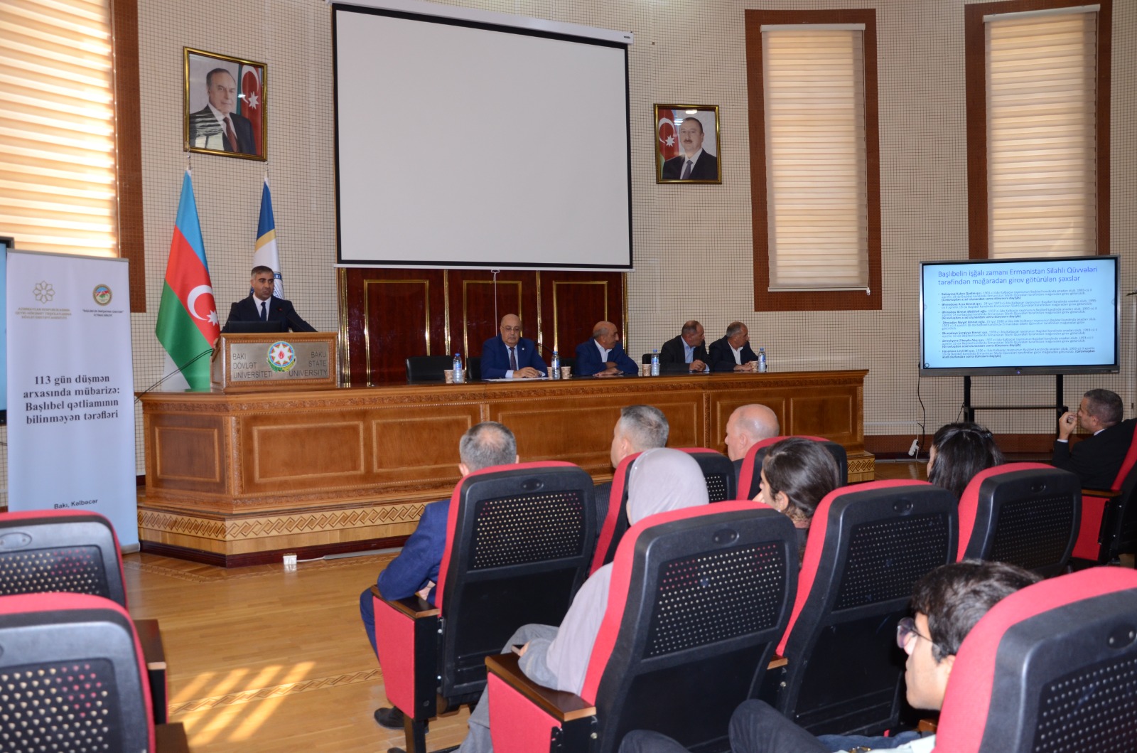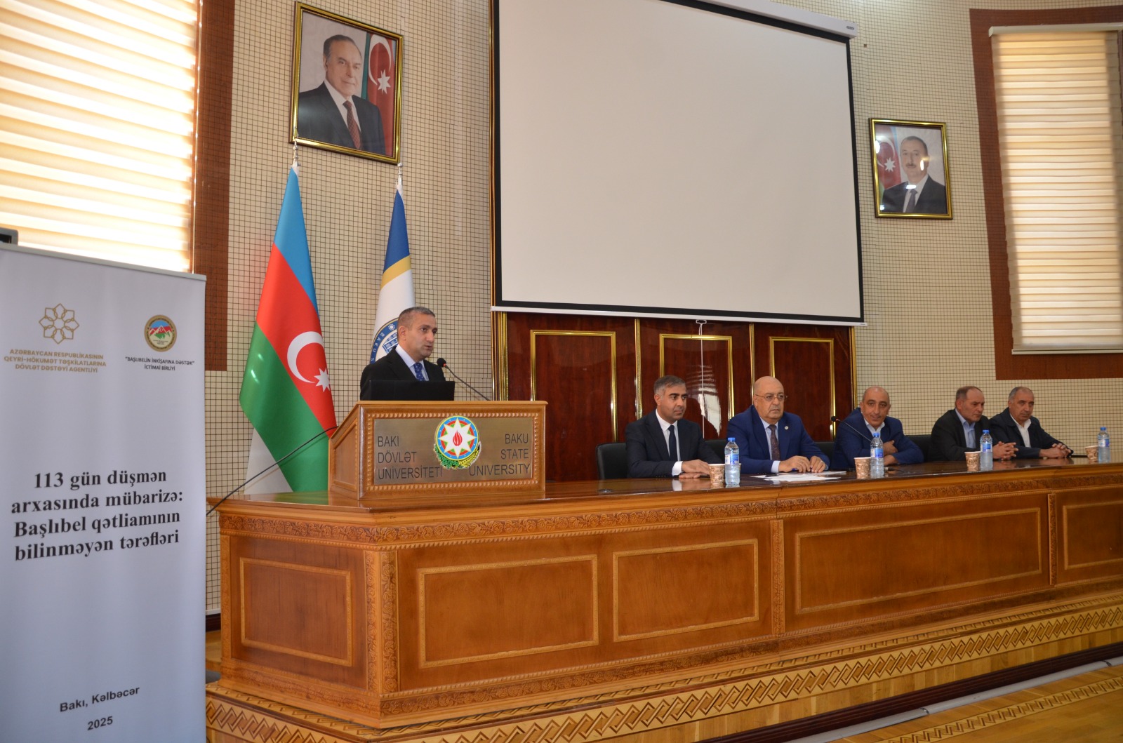 Tədbiri giriş sözü ilə açan BDU-nun İnformasiya və sənəd menecmenti fakültəsinin dekanı Ələmdar Cabbarlı gənc nəslin Ermənistanın təcavüzkar siyasəti nəticəsində xalqımıza qarşı törədilən qətliamlarla bağlı məlumatlandırılmasının əhəmiyyətli olduğunu qeyd edib. Ə.Cabbarlı bildirib ki, “Başlıbelin İnkişafına Dəstək” İctimai Birliyinin “113 gün düşmən arxasında mübarizə: Başlıbel qətliamının bilinməyən tərəfləri” layihəsi bu mənada çox əhəmiyyətlidir.
