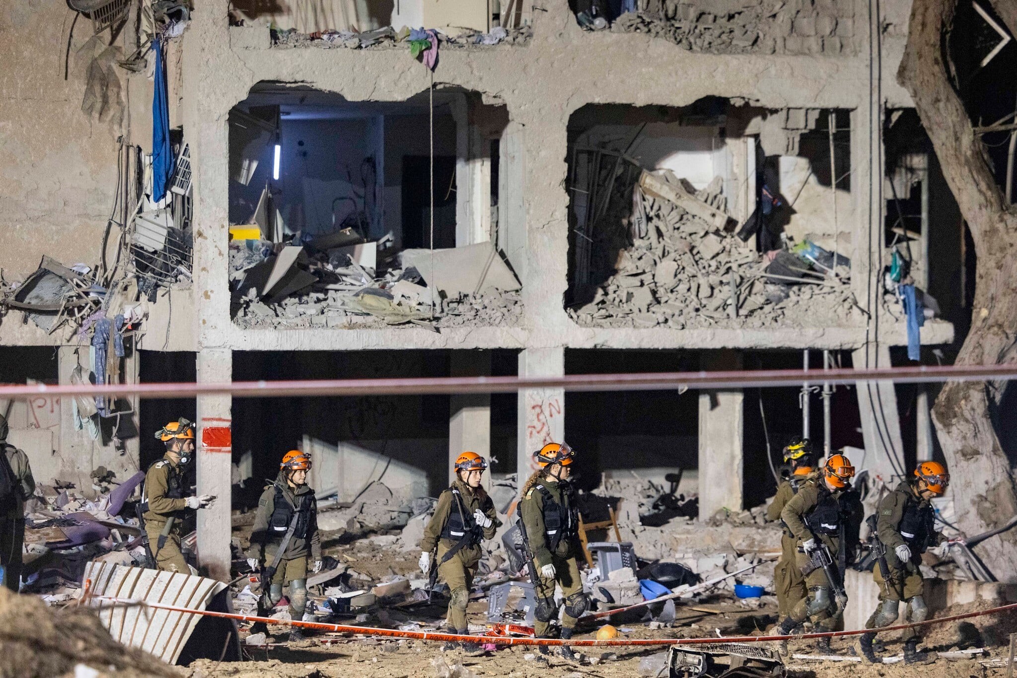 22 mart 2026-cı il. İsrailin cənubundakı Arad şəhərində İrandan atılan raketin yaşayış binalarına ziyan vurduğu və mülki şəxslərin yaralandığı yerdə təhlükəsizlik və xilasetmə qüvvələri(Chaim Goldberg/Flash90).