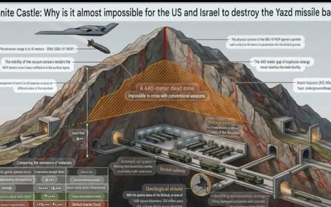 "Yəzdin qranit dağlarının dərinliklərində İran tarixin ən qabaqcıl yeraltı raket komplekslərindən birini inşa edib və buŞ 1990-cı illərdə müharibədən sonrakı erkən müdafiə strategiyalarından 2026-cı ilə qədər tam inteqrasiya olunmuş, süni intellektlə əlaqəli hərbi ekosistemə çevrilib. Yer altında 500 metrə qədər dərinlikdə inşa edilən bu tunel və quyulardan ibarət kompleks dərin qazıntı, möhkəmləndirilmiş konstruksiyalar, raket saxlama, dron inteqrasiyası və hipersəs imkanları da daxil olmaqla onilliklər boyu davam edən mühəndislik yenilikləri sayəsində inkişaf etdirilib. Zamanla ərazi komanda mərkəzləri, avtomatlaşdırılmış buraxılış sistemləri, elektromaqnit ekranlama və müstəqil həyat təminatı infrastrukturu olan çoxqatlı bir qalaya çevrilib. Bu gün o, təkcə təhlükəsiz raket bazası kimi deyil, həm də strateji çəkindirmə mərkəzi və İranın dayanıqlı, yüksək texnologiyalı asimmetrik müharibəyə doğru keçidini simvolizə edən ümummilli yeraltı müdafiə şəbəkəsinin əsas komponenti kimi fəaliyyət göstərir..."