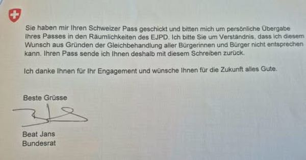 Soydaşımız pasportun təntənəli mərasimdə - bələdiyyə və ya mer tərəfindən vətəndaşa təqdim olunmasının daha yaxşı ola biləcəyini vurğulayaraq yerli post vasitəsi ilə aldığı pasportu birbaşa Federal Şuranın üzvü Beat Jansa geri göndərib. Yazdığı məktubda isə öz istəyini dilə gətirib.