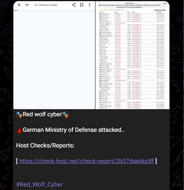 Kiberqruplaşmanın 6 avqust 2025-ci ildə Rusiyanın haktivist qruplaşması olan "NoName057(16") ilə ittifaq elan etdikdən bir neçə saat sonra "Red Wolf" Almaniyanın Müdafiə Nazirliyini hədəf alan kiberhücum kampaniyası başladıb və "Operation Germany" adlandırdıqları əməliyyat çərçivəsində nazirliyin veb-saytına qarşı həyata keçirilmiş "DDoS" hücumun uğurlu olmasını (informasiya resursunun əlçatanlığının pozulmasını) təsdiqləyən "CheckHost" hesabatını paylaşıb.