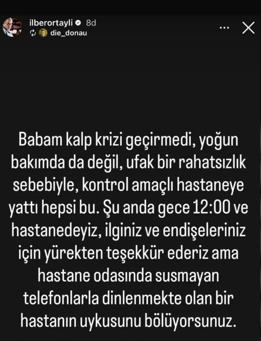 O, atasının infarkt keçirdiyi barədə iddiaları təkzib edib. Bildirilib ki, İlbər Ortaylı xəstəxanaya yalnız nəzarət məqsədilə gedib.