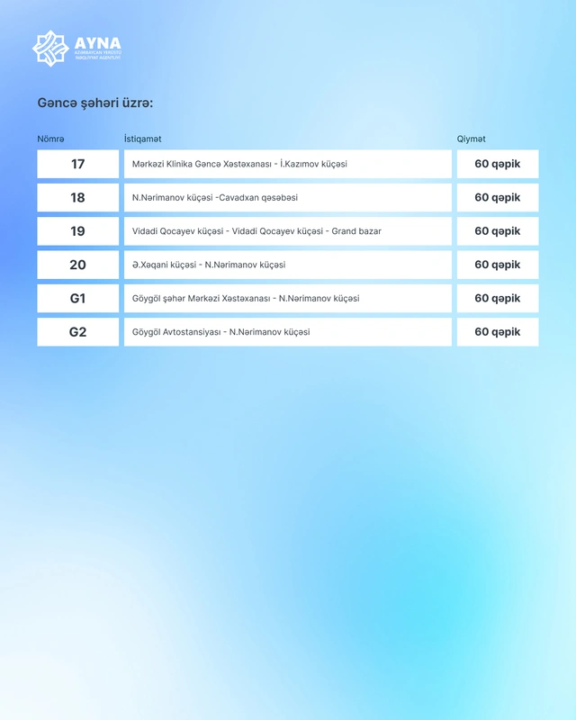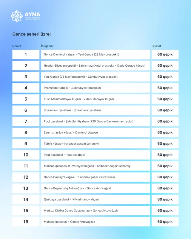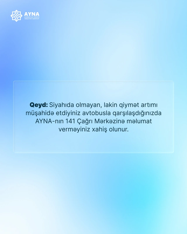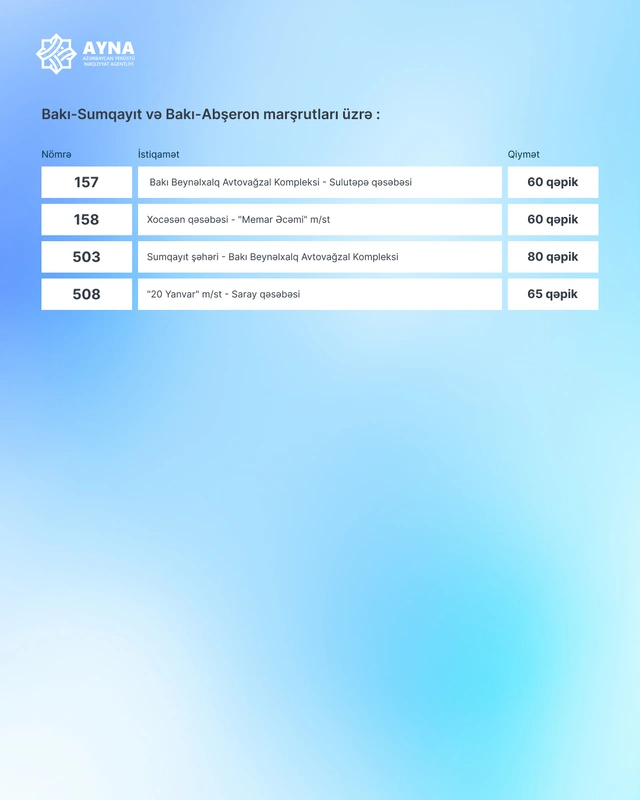 Qeyd edək ki, sentyabrın 29-da Rəqəmsal İnkişaf və Nəqliyyat Nazirliyinin Kollegiyası avtobus marşrutları və metroda sərnişindaşıma üzrə yeni tariflər müəyyən edib. Qərara əsasən, müasir tələblərə cavab verən və yalnız nağdsız ödəniş alətləri vasitəsilə fəaliyyət göstərən müntəzəm şəhərdaxili (rayondaxili), qəsəbələrarası və şəhərətrafı avtobus marşrutlarında sərnişindaşıma xidmətlərinin tariflərinin aşağı həddi (məsafədən asılı olaraq tariflər dəyişir) də 60 qəpik olaraq müəyyən edilib. Qərar oktyabrın 1-dən qüvvəyə minib.