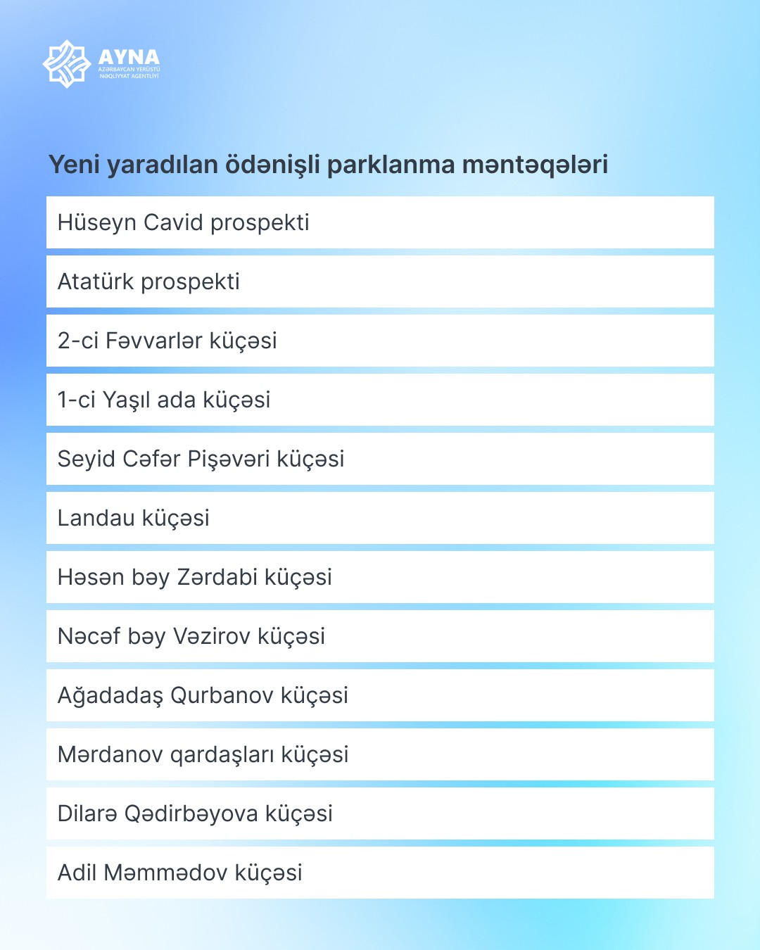 Yaxın günlərdə Dadaş Bünyadzadə, Yeni Yasamal, Məhəmməd Xiyabani, Bəhruz Nuriyev, Naxçıvanski, Şirin Mirzəyev, Məshəti Gəncəvi, Mehdi Abbasov, Bəkir Çobanzadə və Ədhəm Orucəliyev küçələrində parklanma yerləri istifadəyə veriləcək. Nişanlanma xətlərinin çəkildiyi küçələrdə müvafiq yol nişanları quraşdırılacaq və yeni məntəqələr nəqliyyat vasitələri sahiblərinin ixtiyarında olacaq.