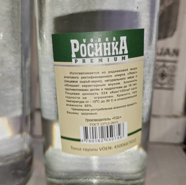 Baxış zamanı satış sahəsində aşkar saxtalaşdırma əlamətləri olan “Organic Росинка” əmtəə nişanlı 98 ədəd 0.7 litrlik, 112 ədəd 0.5 litrlik alkoqollu içki aşkarlanıb. Belə ki, içkilərin başlıq hissəsinin təkrar bərkidildiyi, istehsal tarixləri və istehsalçı barədə məlumatların qeyd olunmadığı, saxta VÖEN göstərildiyi, müşayiətedici sənədlərinin olmadığı müəyyən edilib. Məhsullardan nümunələr götürülərək laborator müayinələrə cəlb olunub.
