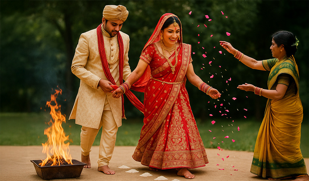 Hindistan toylarının ən təsirli mərasimi saptapadidir. Bu söz sanskritcə “birlikdə yeddi addım atmaq” deməkdir. Bu ritual müqəddəs atəşin (Aqni) ətrafında keçirilir və yeddi kiçik düyü topası düzülür. Gəlin və bəy gəlinin sağ ayağı ilə qərbdən başlayaraq hər bir topanın üzərindən addım atır. Cütlük yeddi dövrə vurduqca bir-birinə yeddi əsas prinsipi yerinə yetirəcəyinə söz verir. Hər addım sağlam həyatın, ruhani gücün, rifahın, sevgi və hörmətin, xoşbəxt ailənin, uzun ömrün və bir-birinə sədaqətin simvoludur. Addımlarını atarkən əllərini dupatta (gəlinin çiyinə sarılan uzun, rəngli şal) və ya çuni (nazik, uzun örtük) ilə bir-birinə bağlayırlar, ailə üzvləri isə gül yarpaqları və düyü səpməklə onlara xeyir-dua verir.