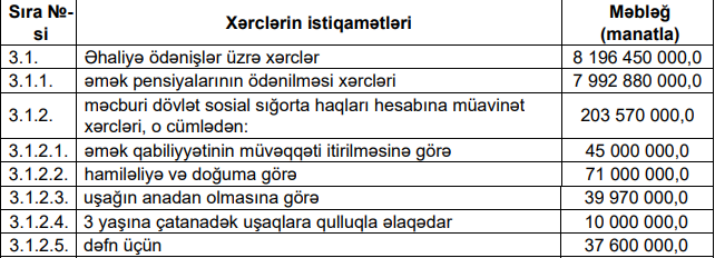 Sənədə əsasən, növbəti ildə əhaliyə ödənişlər üzrə proqnozlaşdırılmış məbləğin 7992,88 mln. manatı əmək pensiyalarının, 203,57 mln. manatı isə məcburi dövlət sosial sığorta haqları hesabına verilən müavinətlərin ödənilməsinə yönəldiləcək.