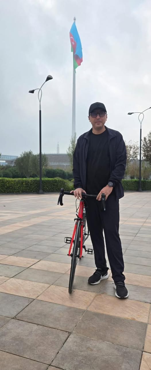 Foto Bakı bulvarının Bayraq Meydanına yaxın hissəsində - Azərbaycan bayrağının fonunda çəkilib. Görünür, istirahət günündən istifadə edən F.Qayıbov bulvara velosiped sürməyə çıxıb.