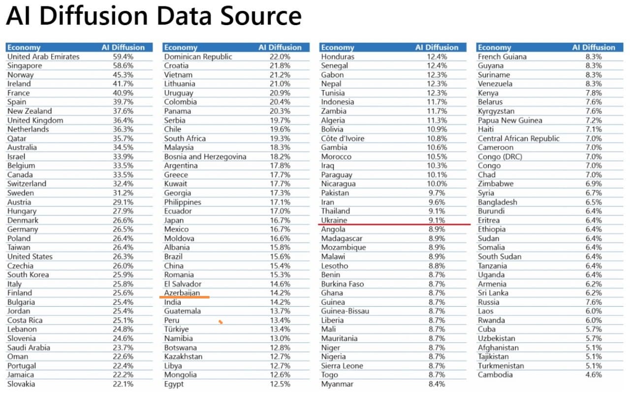 Süni intellektin ən geniş yayıldığı ölkələr BƏƏ (59,4%), Sinqapur (58,6%), Norveç (45,3%) və İrlandiyadır (41,7%).