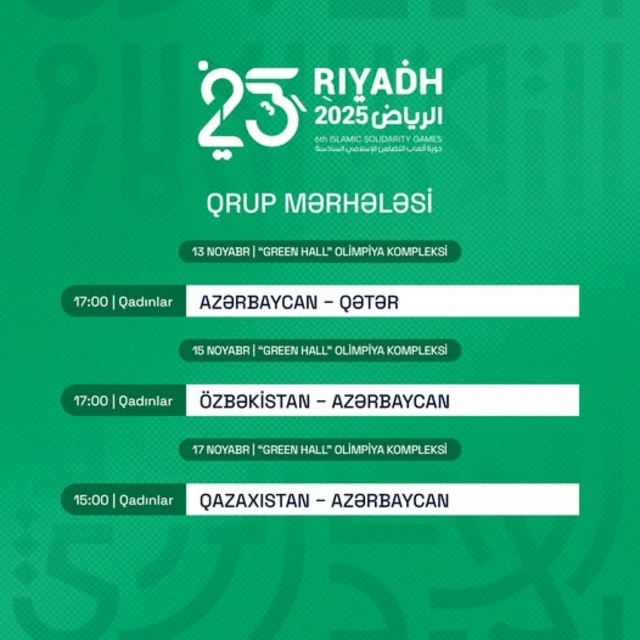 Azərbaycanın qadınlardan ibarət həndbol millisinin Səudiyyə Ərəbistanının paytaxtı Ər-Riyadda keçirilən VI İslam Həmrəyliyi Oyunlarındakı matçlarının vaxtı müəyyənləşib.