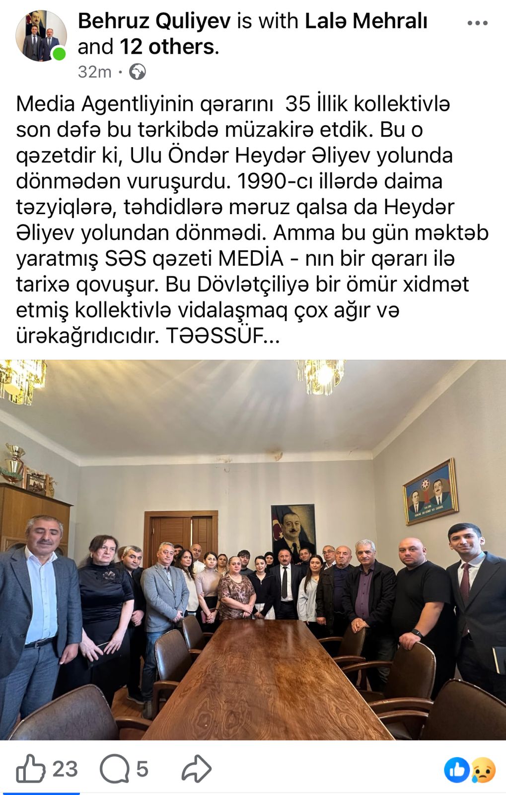 "Media Agentliyinin qərarını 35 illik kollektivlə son dəfə bu tərkibdə müzakirə etdik. Bu o qəzetdir ki, Ulu Öndər Heydər Əliyev yolunda dönmədən vuruşurdu. 1990-cı illərdə daima təzyiqlərə, təhdidlərə məruz qalsa da Heydər Əliyev yolundan dönmədi. Amma bu gün məktəb yaratmış SƏS qəzeti MEDİA-nın bir qərarı ilə tarixə qovuşur. Bu Dövlətçiliyə bir ömür xidmət etmiş kollektivlə vidalaşmaq çox ağır və ürəkağrıdıcıdır" - o qeyd edib.