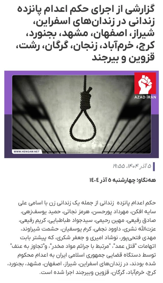 İranda bir gündə biri qadın olmaqla 15 məhbus dar ağacından asılıb.