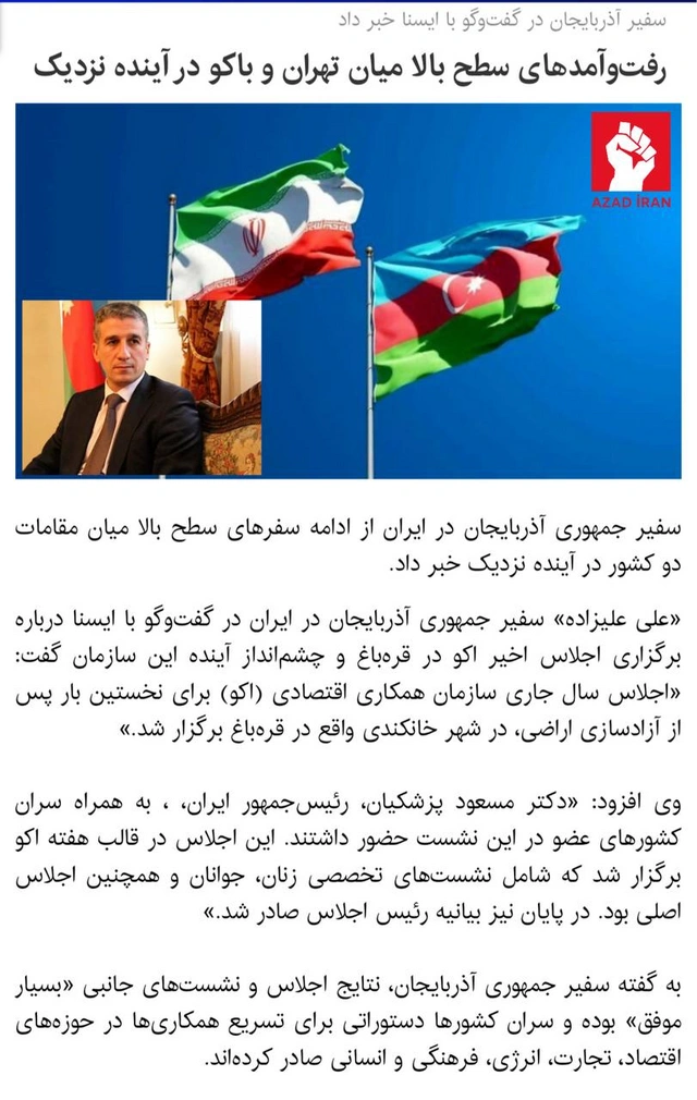 Azərbaycanın İrandakı səfiri Əli Əlizadə ISNA agentliyinə müsahibəsində iki ölkə arasında yüksək səviyyəli səfərlərin yaxın gələcəkdə davam etdiriləcəyini açıqlayıb.