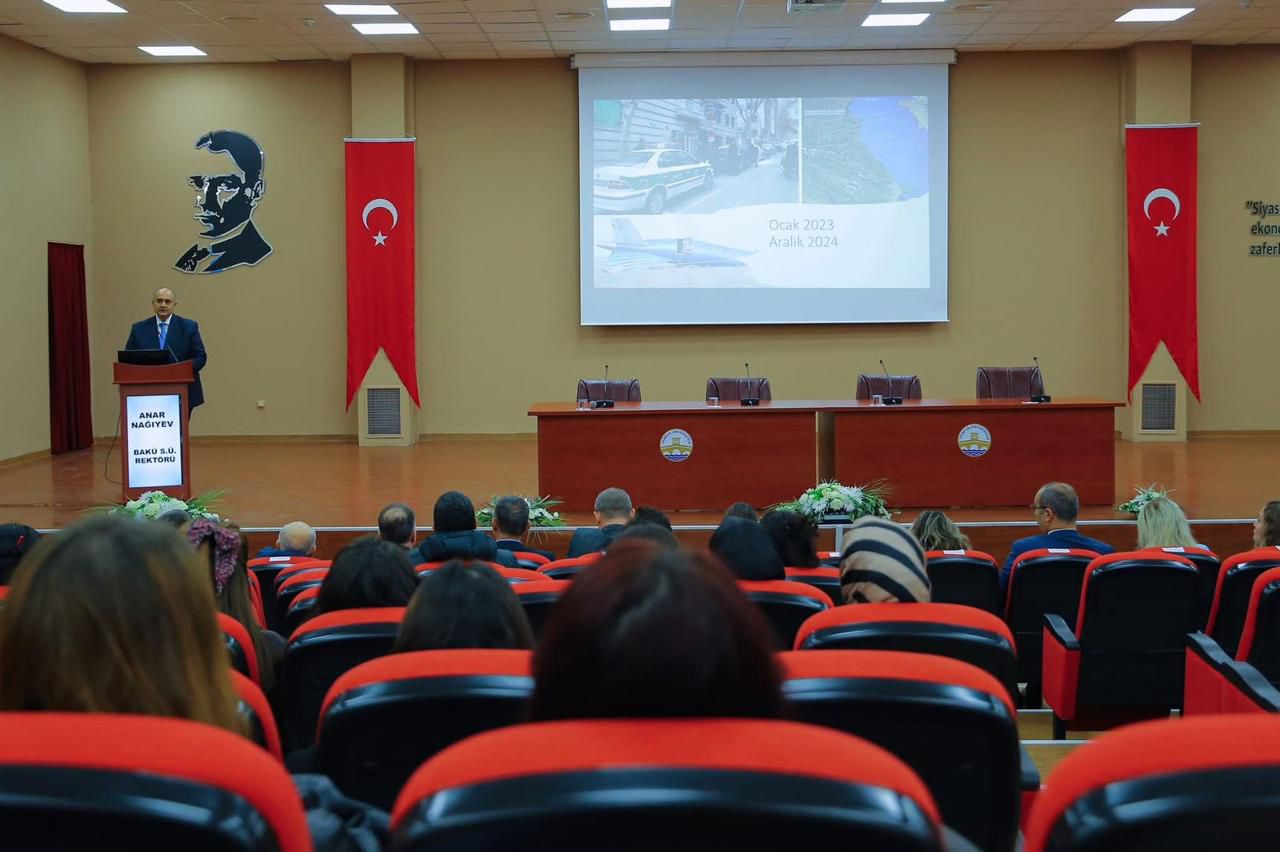 Rektor Anar Nağıyev çıxışında dəyişən geosiyasi reallıqlar fonunda siyasi coğrafiyanın dövlətlərin inkişafında və beynəlxalq mövqelərinin formalaşmasında oynadığı rolu xüsusi vurğulayıb. O, coğrafi mövqe və qonşuluq amillərinin ölkələrin siyasi, iqtisadi və təhlükəsizlik arxitekturasına birbaşa təsir etdiyini qeyd edərək, bu kontekstdə Azərbaycanın Türk Dünyası, Avropa, Asiya və Yaxın Şərq regionlarında artan rolundan bəhs edib.