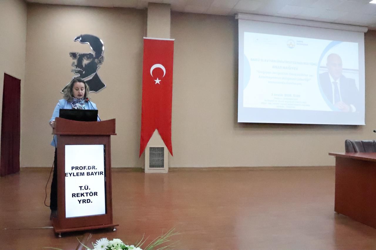 Trakya Universitetinin prorektoru Eylem Bayır tədbirin açılışında çıxış edərək mövzunun aktuallığını vurğulayıb və BSU-nun rektoru Anar Nağıyevi çıxış etməyə dəvət edib.