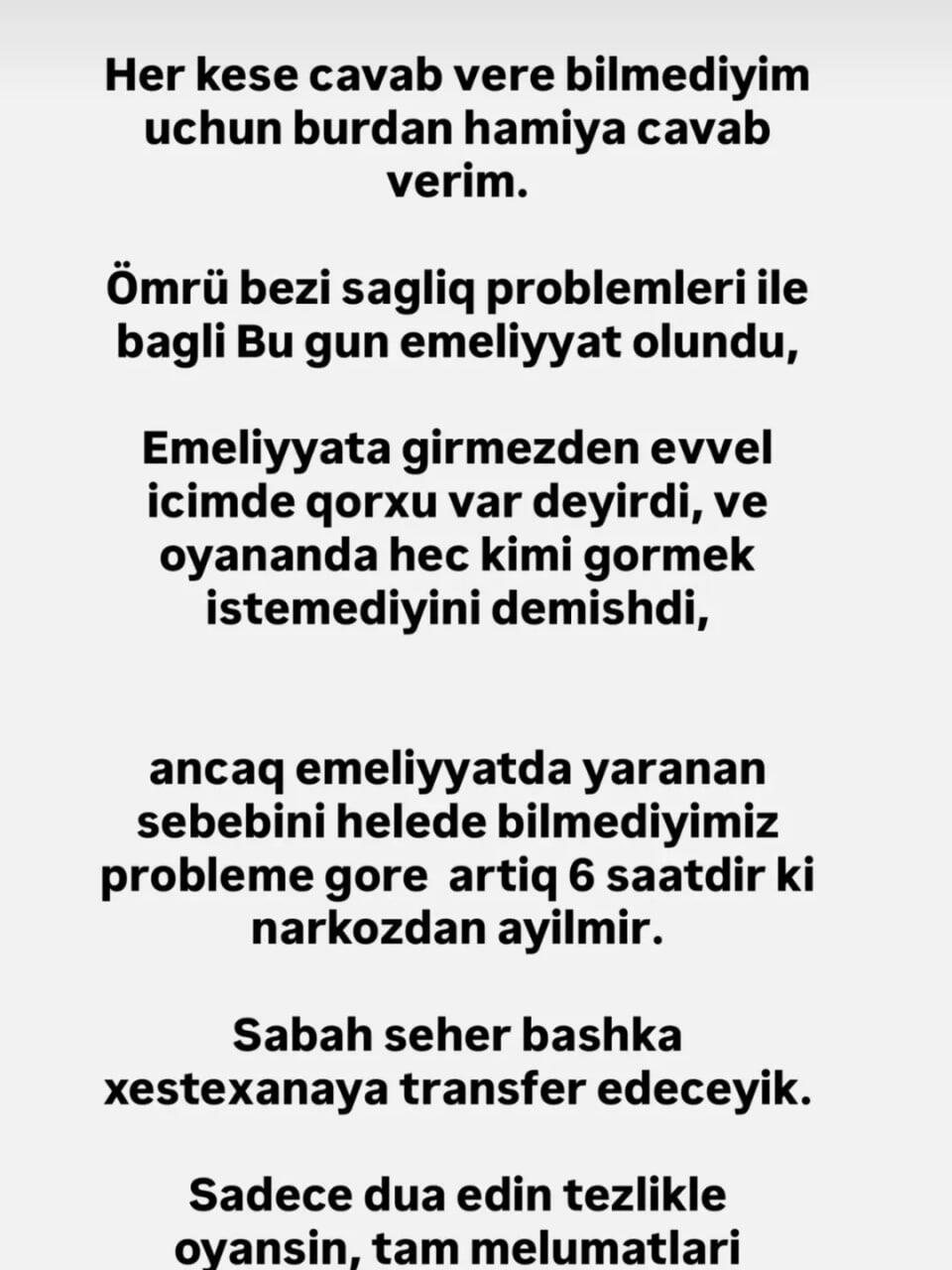 Ötən gün onun əməliyyat edildiyi və vəziyyəti ağırlaşaraq komaya düşdüyü qeyd edilib.