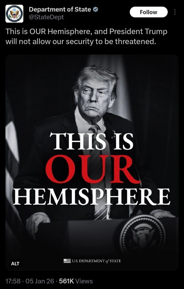 "Bu, bizim yarımkürəmizdir və Prezident Tramp bizim təhdid edilməyimizə icazə verməyəcək", - deyə paylaşımda bildirilib.