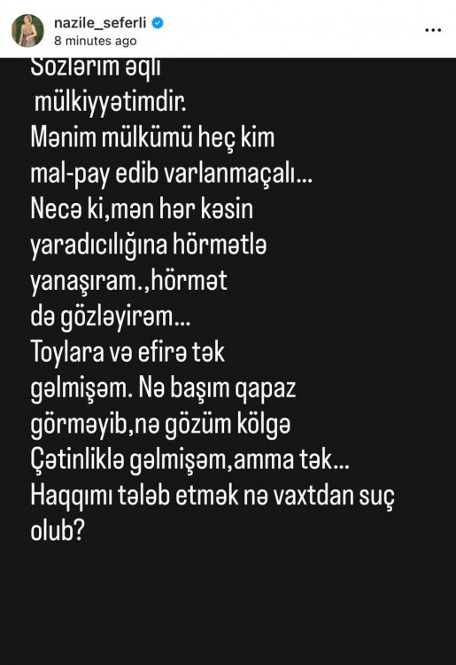 "Sözlərim əqli mülkiyyətimdir. Mənim mülkümü heç kim mal-pay edib varlanmamalıdır. Necə ki, mən hər kəsin yaradıcılığına hörmətlə yanaşıram, hörmət də gözləyirəm. Toylara və efirə tək gəlmişəm. Nə başım qapaz görüb, nə gözüm kölgə. Çətinliklə gəlmişəm, amma tək. Haqqımı tələb etmək nə vaxtdan suç olub?"