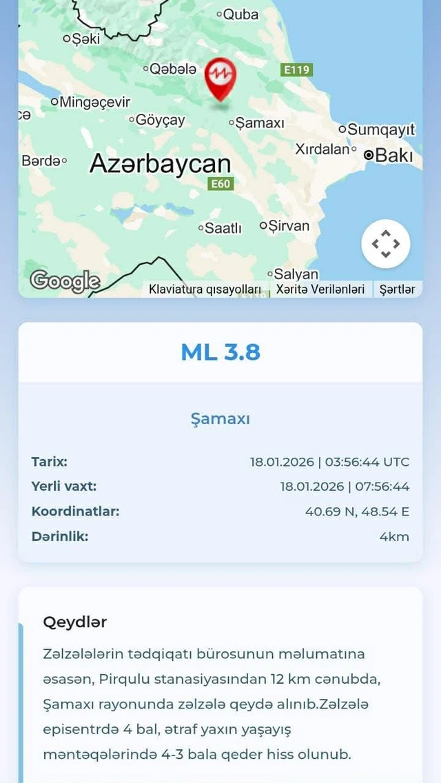 "Azərbaycan Milli Elmlər Akademiyası nəzdində Respublika Seysmoloji Xidmət Mərkəzindən Fövqəladə Hallar Nazirliyinin Böhran Vəziyyətlərində İdarəetmə Mərkəzinə daxil olmuş məlumata əsasən, 18.01.2026-cı il tarixində yerli vaxtla saat 07:56-da Şamaxı-Ağsu sərhəddi (Ağsu) rayonunda 3.8 maqnituda zəlzələ qeydə alınıb. Zəlzələ nəticəsində hər hansı dağıntı və ya insan xəsarəti barədə Fövqəladə Hallar Nazirliyinə məlumat daxil olmayıb", - məlumatda deyilir.