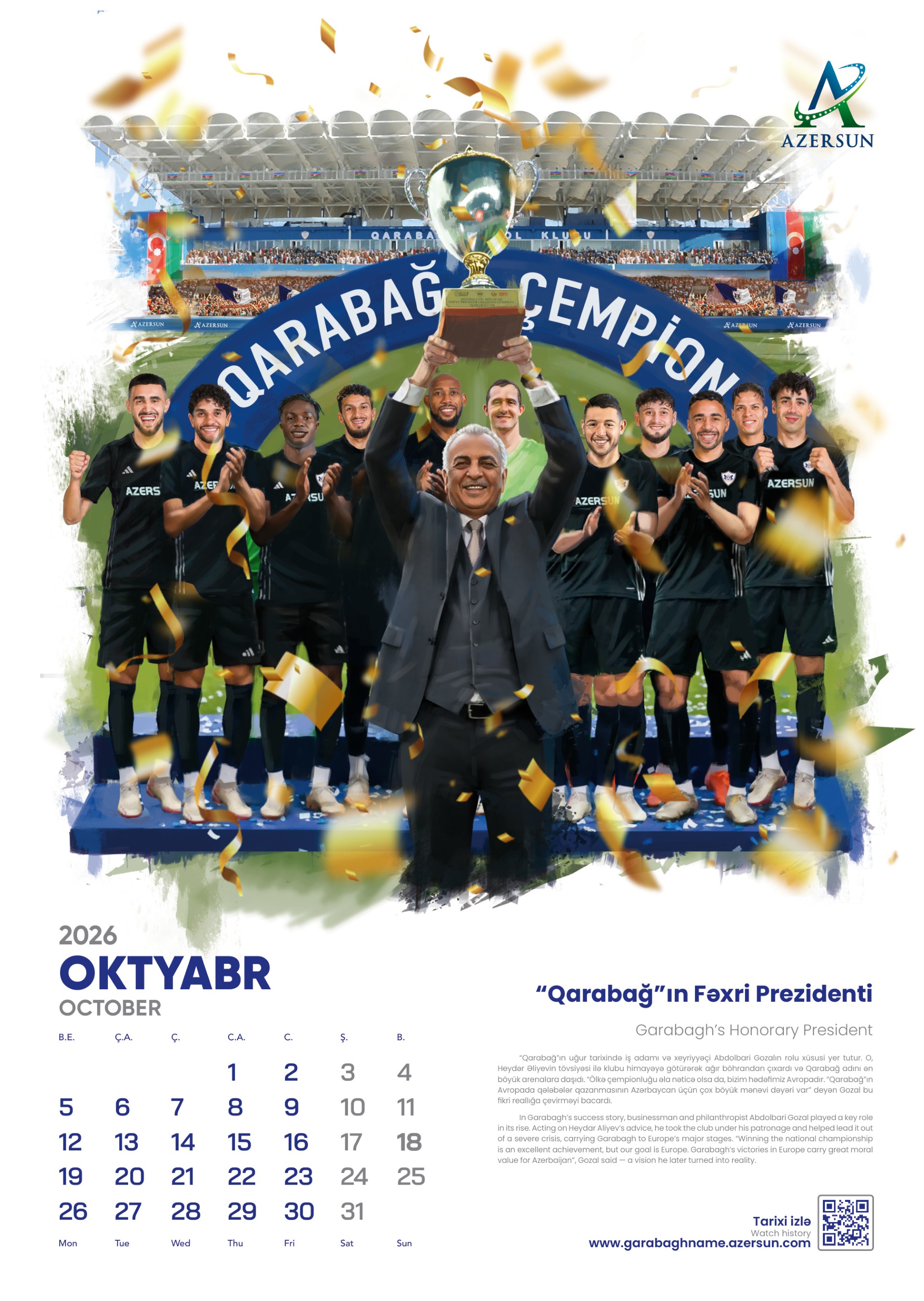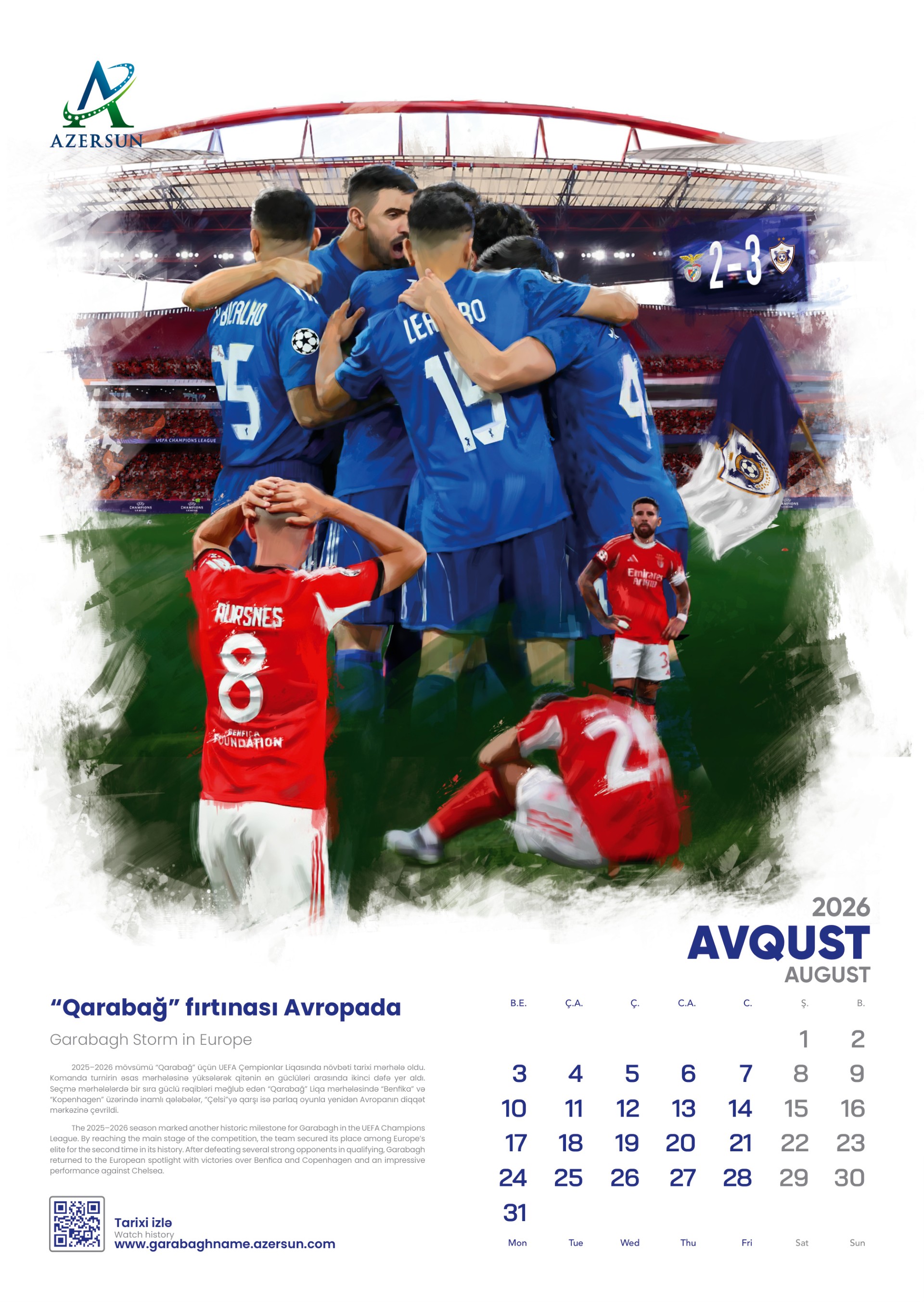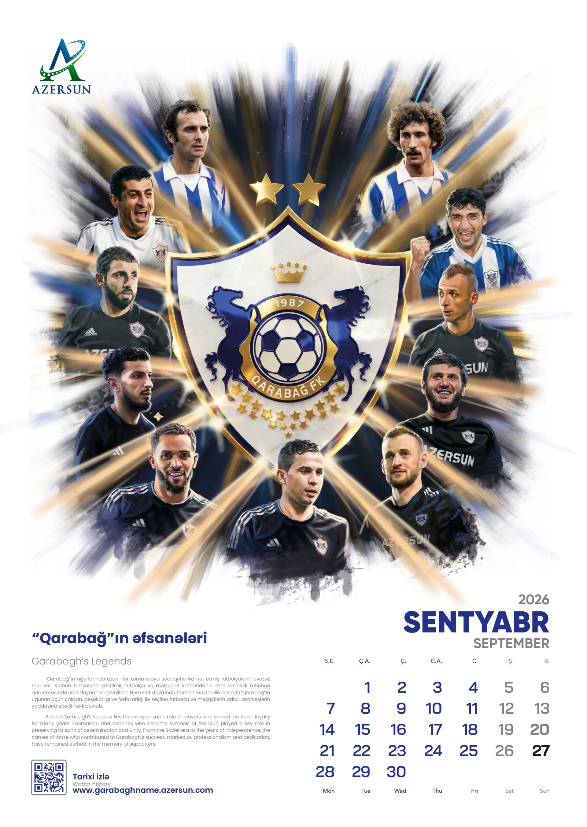Moderator.az xəbər verir ki, 2026-cı il üçün hazırlanan bu təqvim son illərdə futbol sahəsində qızıl dövrünü yaşayan “Qarabağ” futbol klubuna həsr olunub.