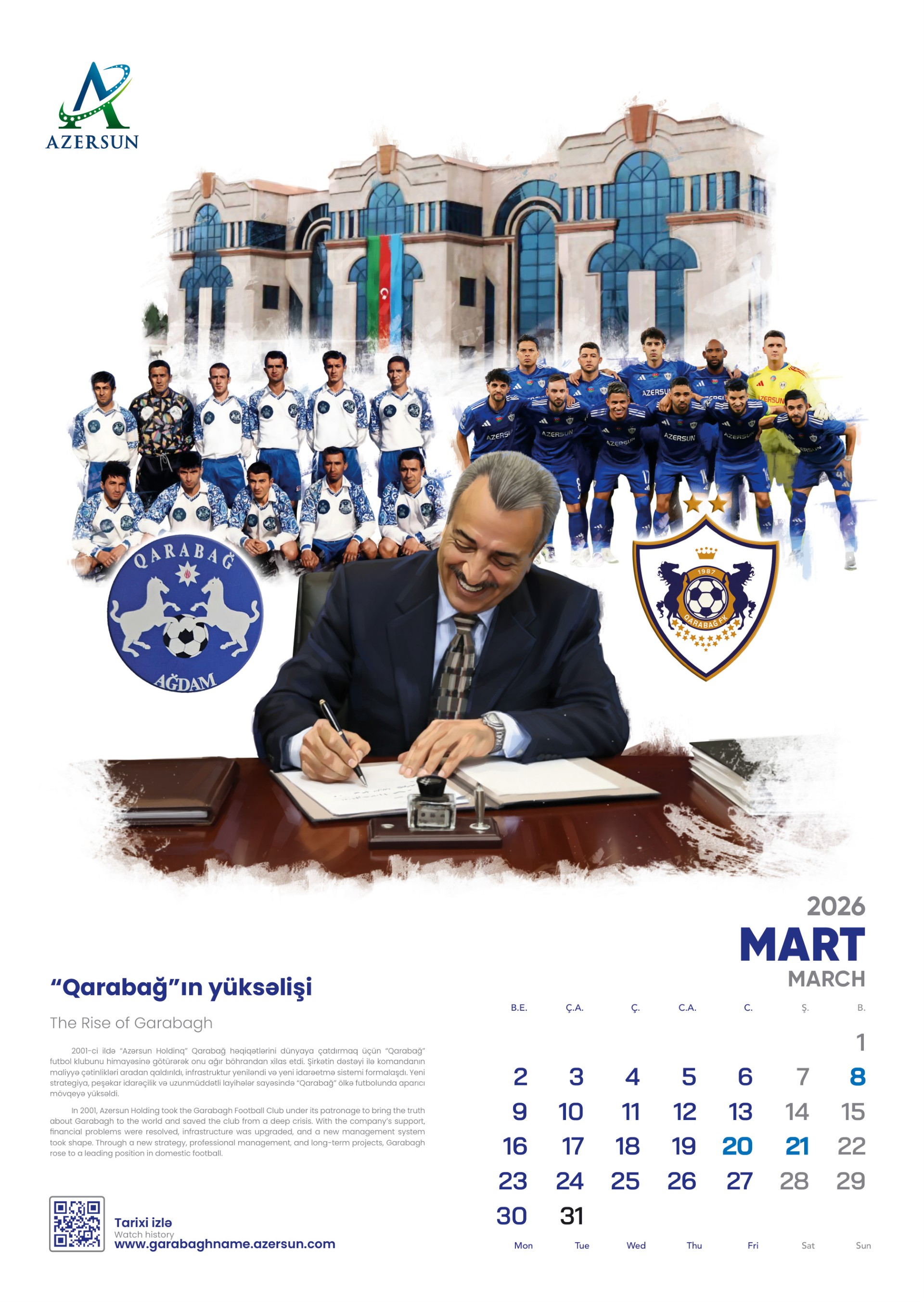 Təqvimdə həmçinin, holdinqin ədəbi qurucusu mərhum Abdolbari Gozalın klubun fəxri prezidenti olması, “Qarabağ”ın əfsanəvi futbolçuları, eləcə də komandanın ölkə daxilində və beynəlxalq arenada qazandığı tarixi qələbələrdən bəhs olunur.