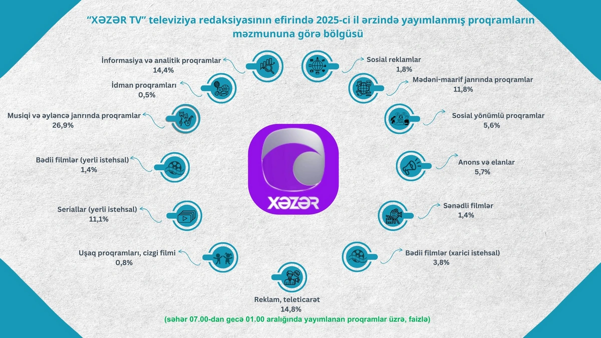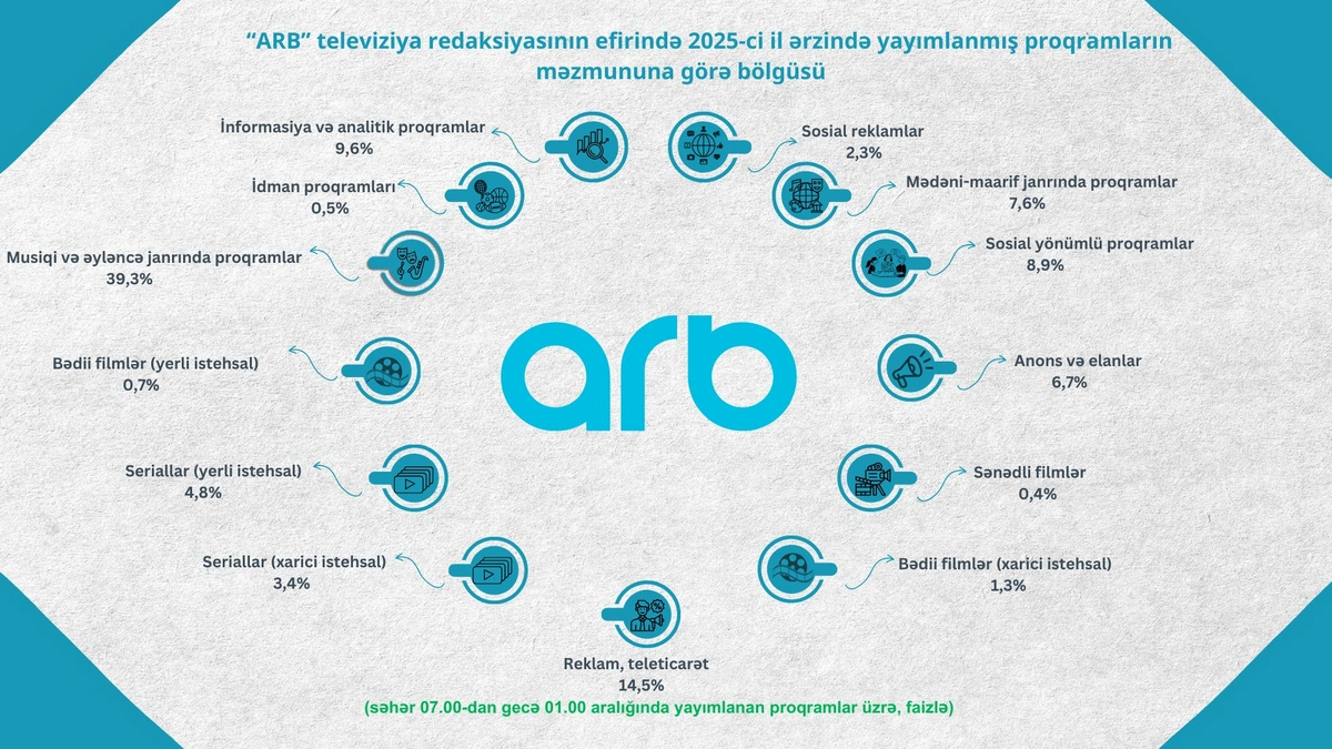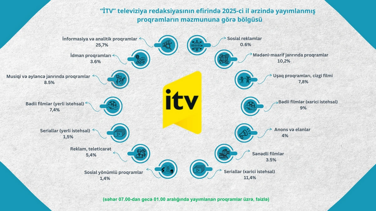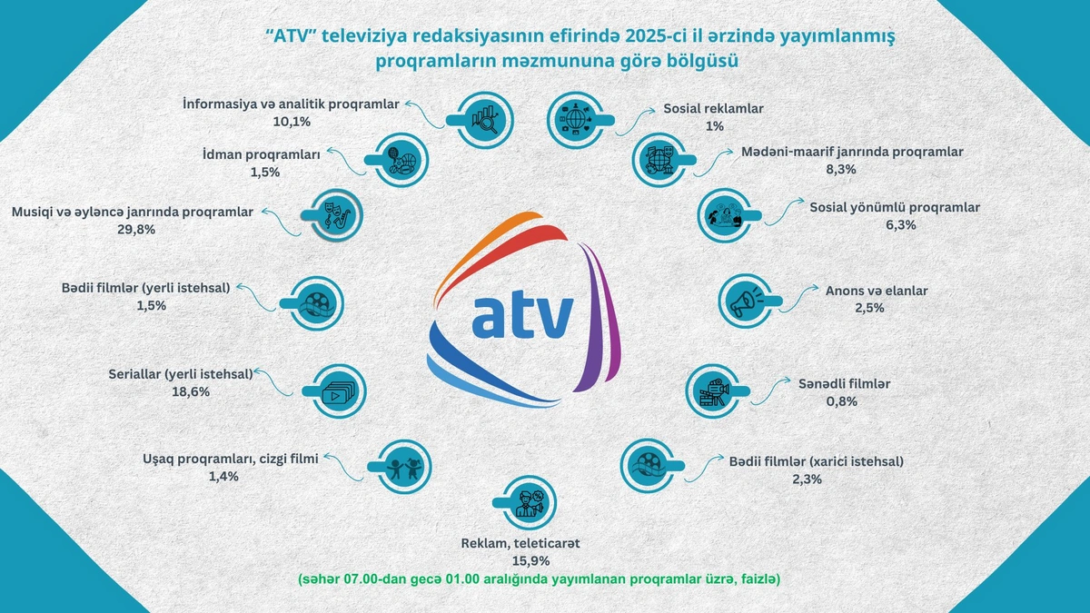 Azərbaycanda 2025-ci il üzrə ümumölkə yerüstü televiziya yayımçılarının proqramlarının janr bölgüsü açıqlanıb.