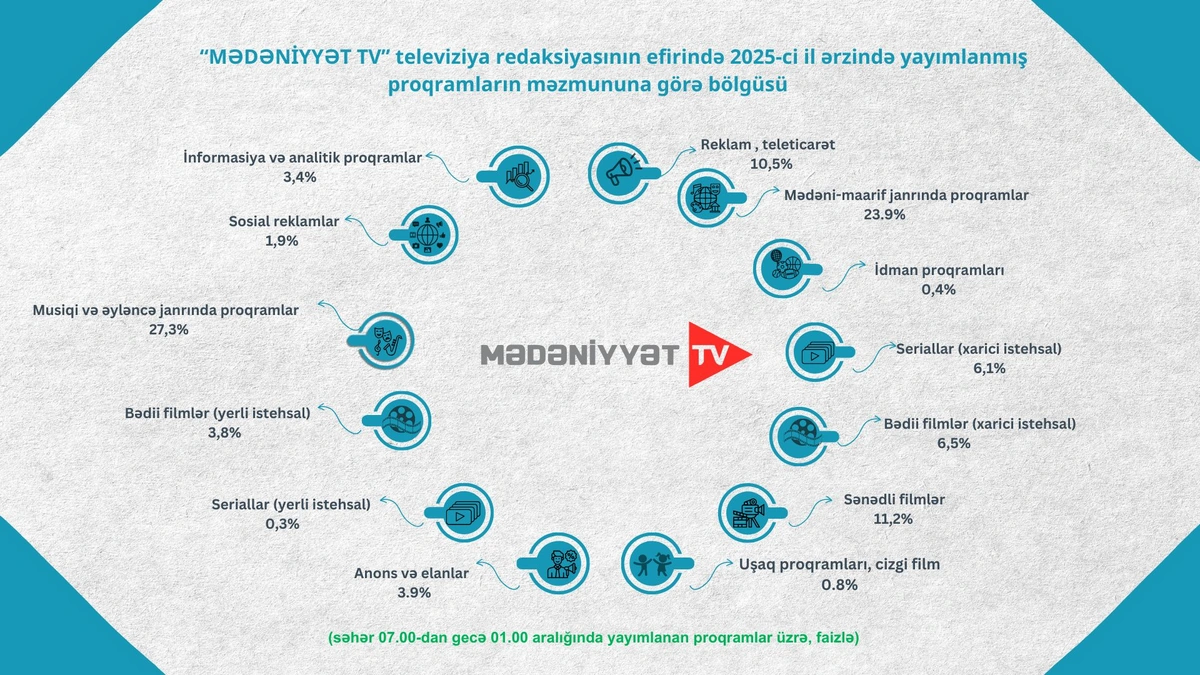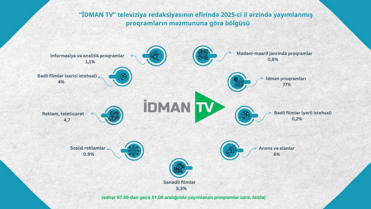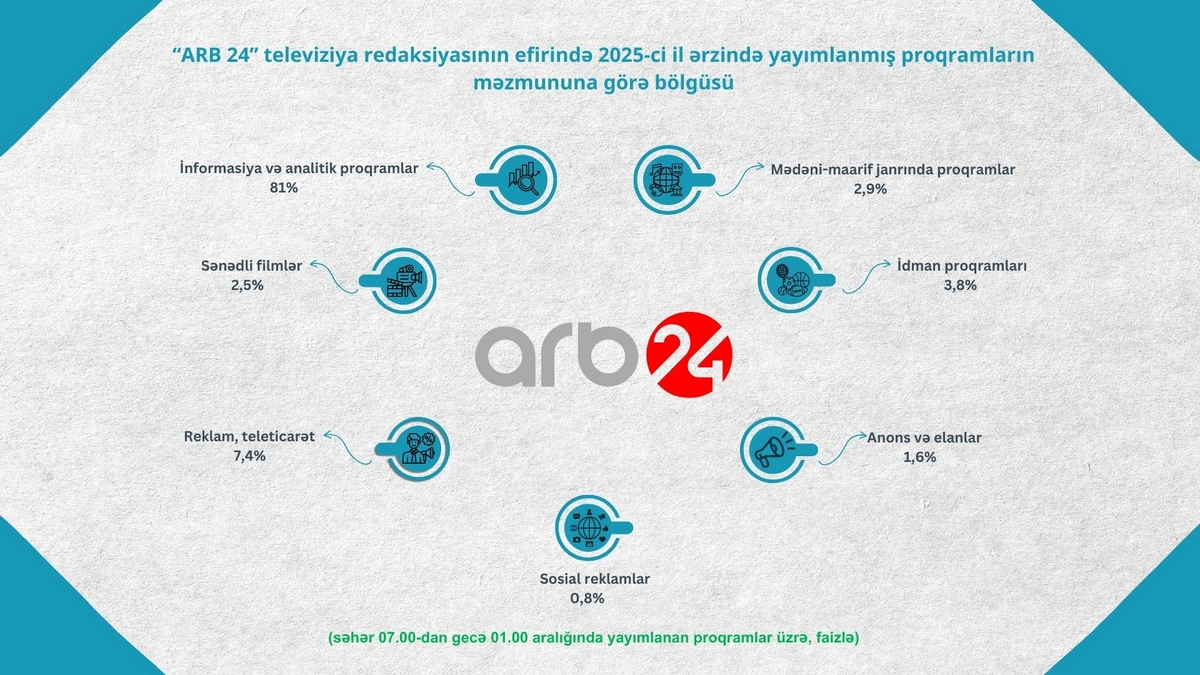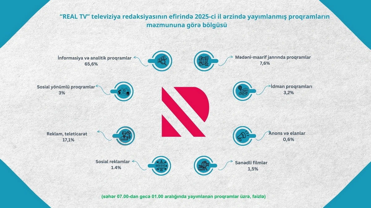 Azərbaycanda 2025-ci il üzrə ümumölkə yerüstü televiziya yayımçılarının proqramlarının janr bölgüsü açıqlanıb.