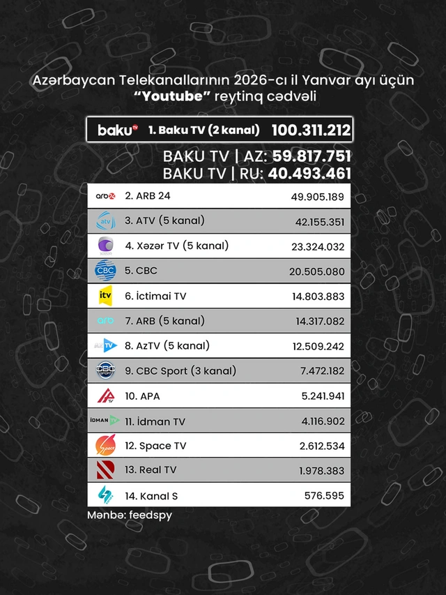 Azərbaycan telekanallarının "YouTube" baxışları üzrə 2026-ci ilin yanvar ayı üçün reytinq cədvəli açıqlanıb.