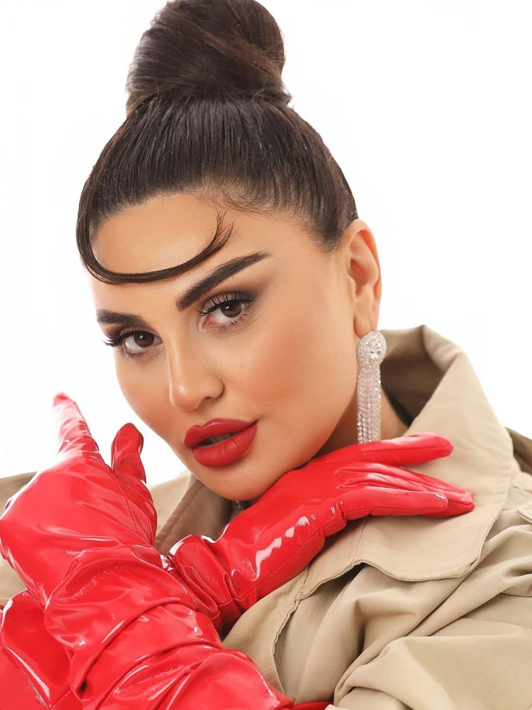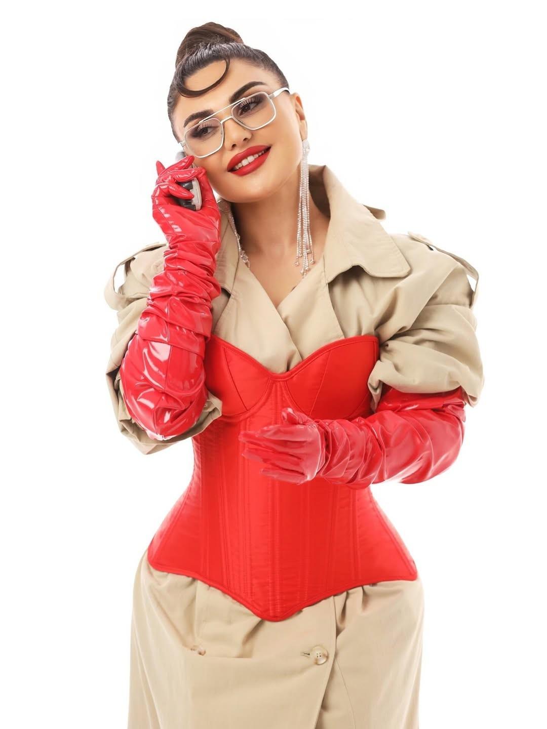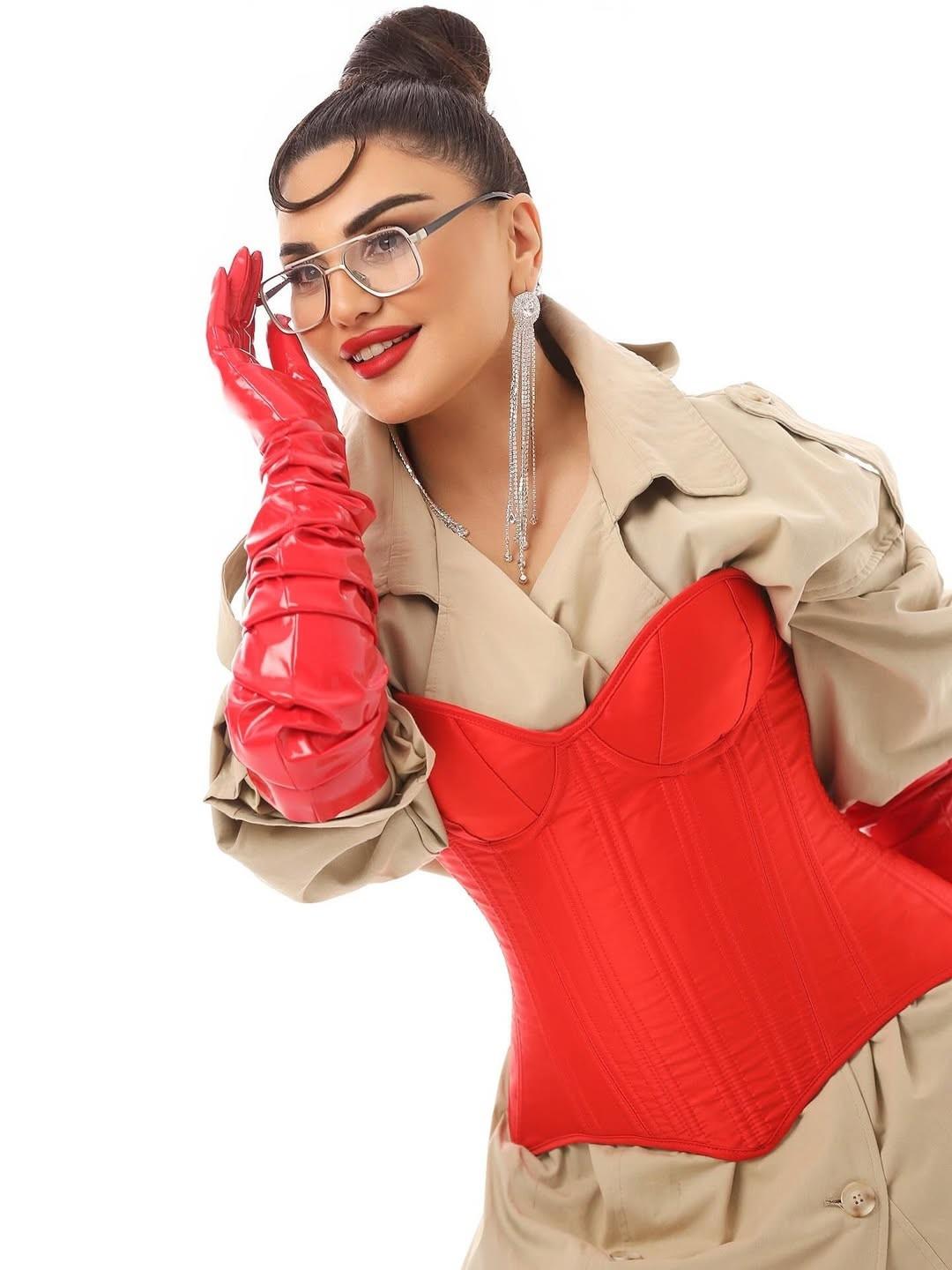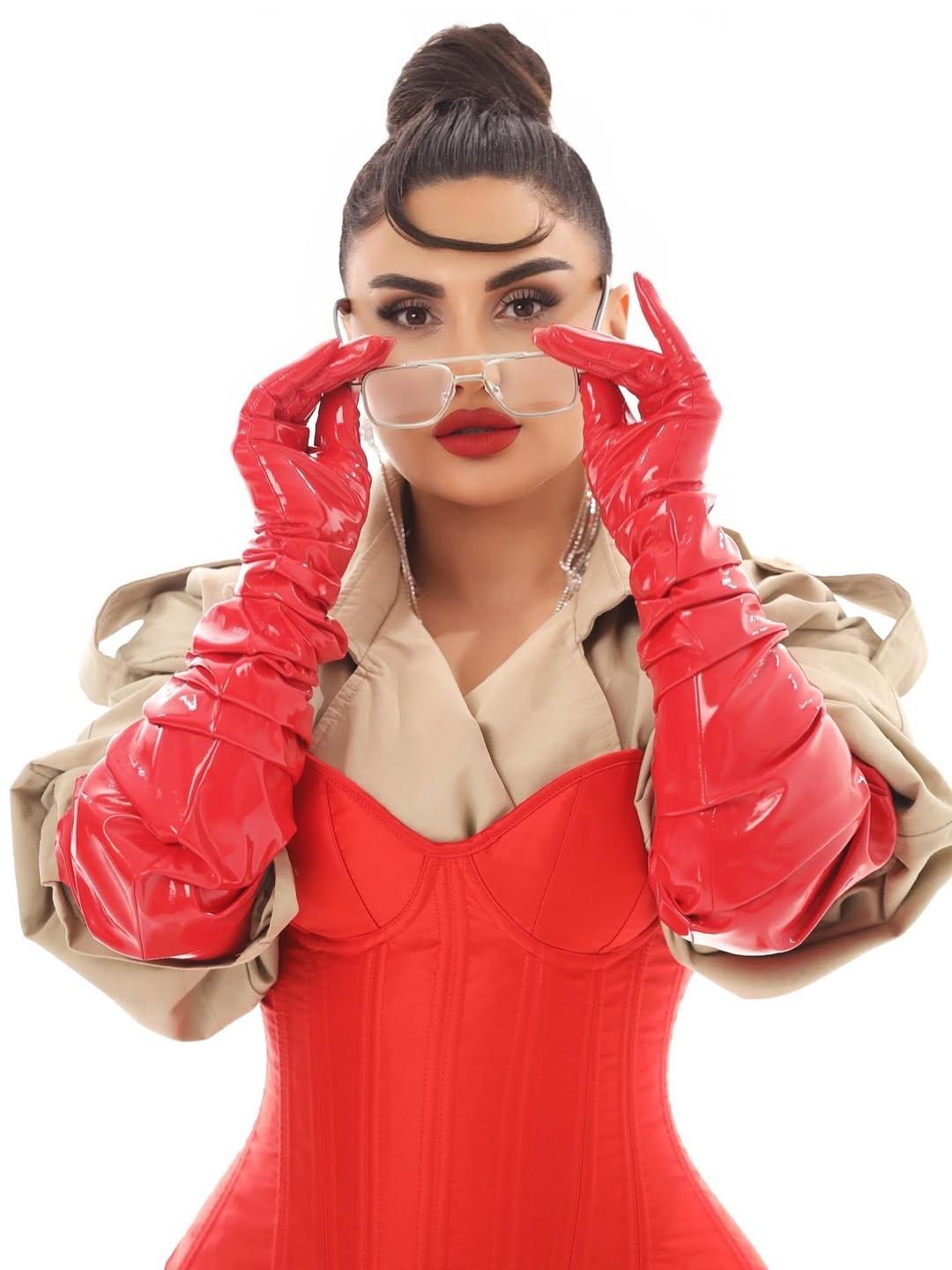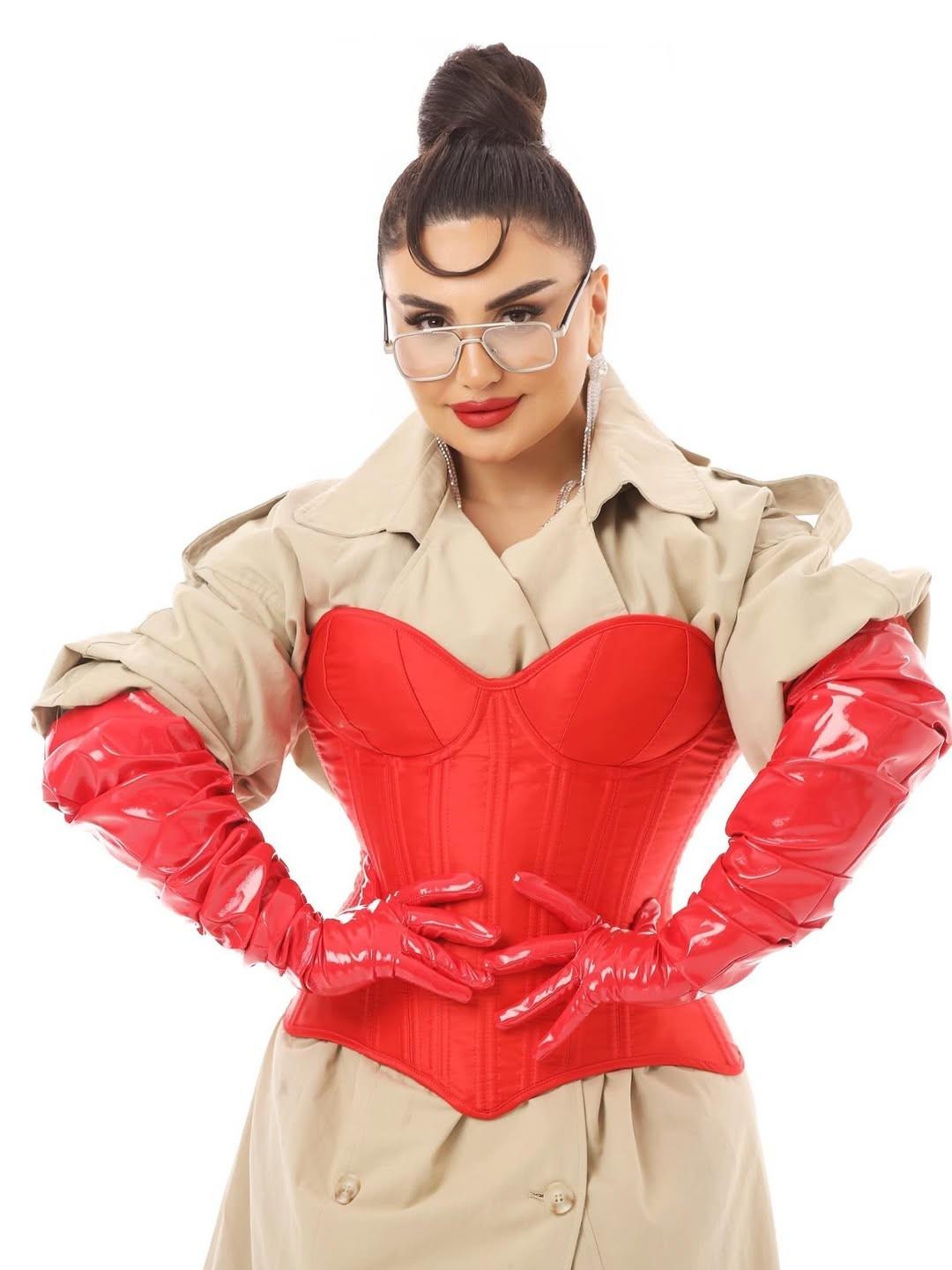 Sənətçi kamera qarşısına krem rəngli plaşla çıxıb və geyimin üstündən qırmızı korset seçib. Obrazını qırmızı dəri əlcəklər və eynəklə tamamlayan Şəbnəm fərqli üslubu ilə seçilib.