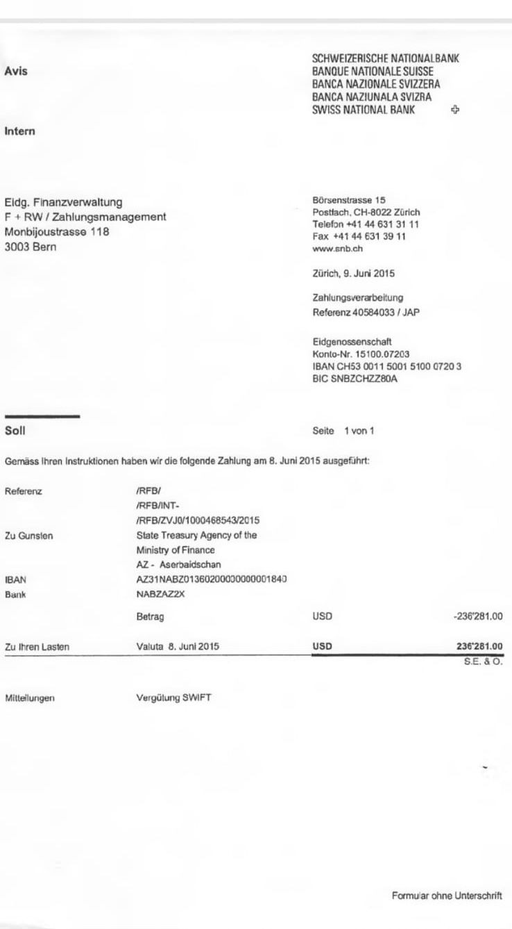 Bu məsələ ilə əlaqədar İsveçrə hökumətinin ödədiyi vəsaitin çeki də mövcuddur.