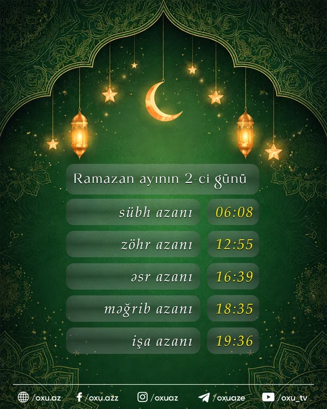 Qafqaz Müsəlmanları İdarəsinin açıqladığı ramazan təqviminə əsasən, fevralın 20-də iftar vaxtı saat 18:35-dədir.